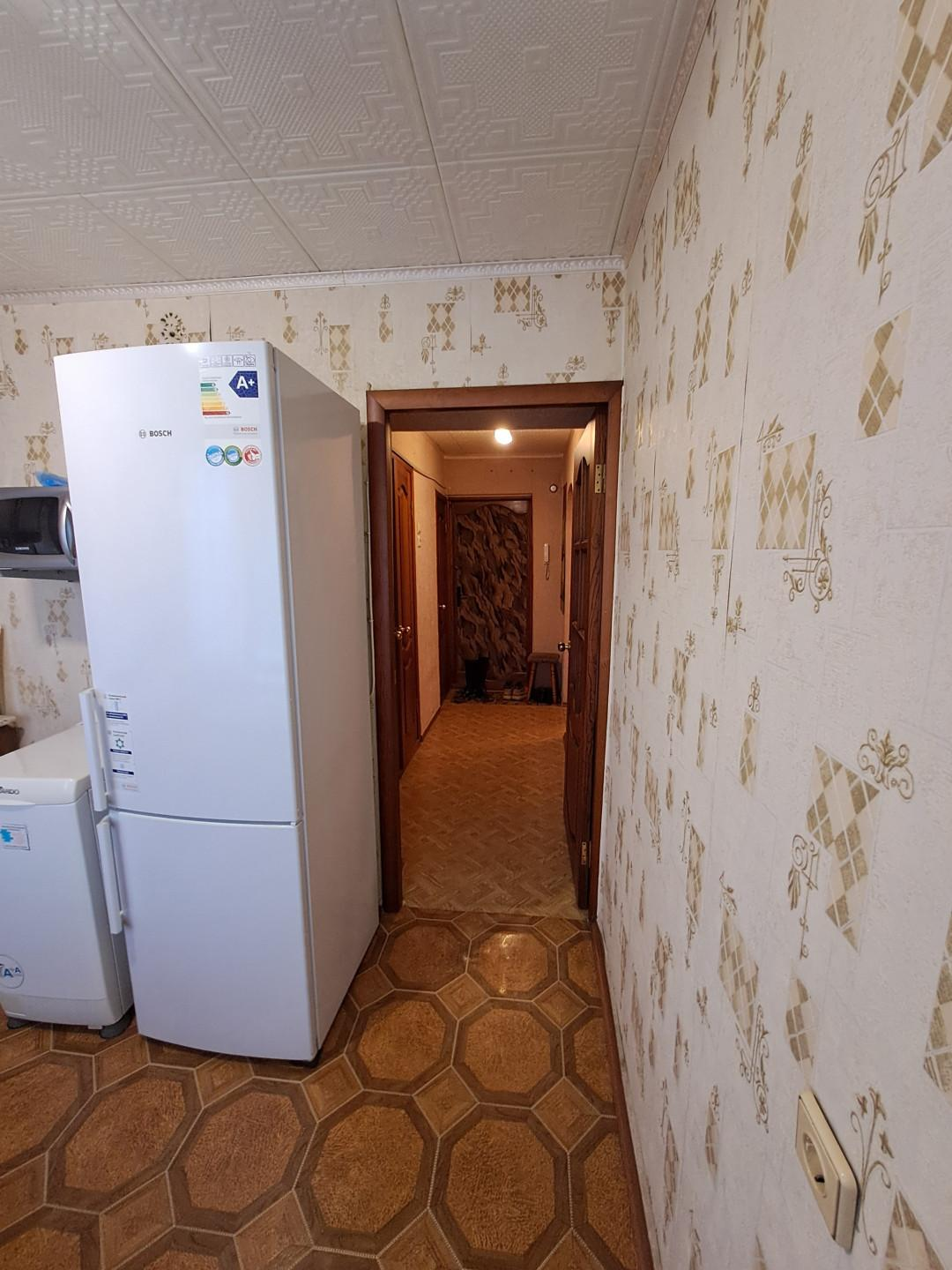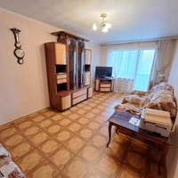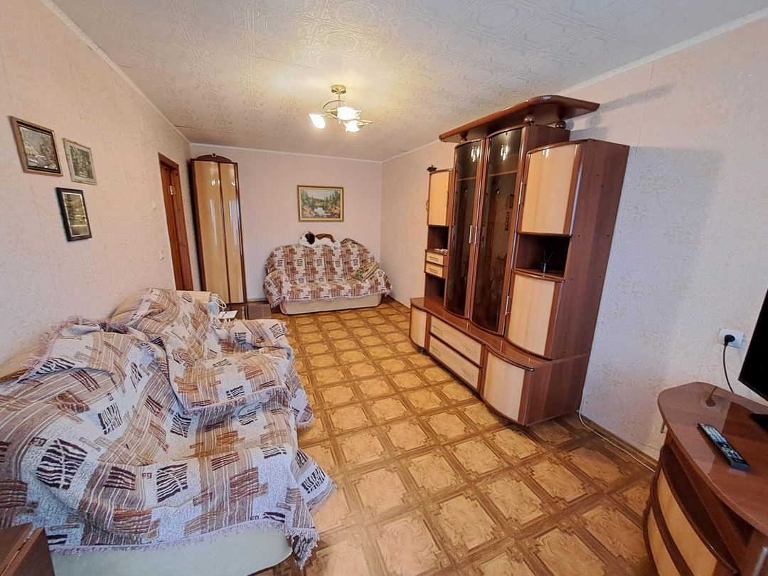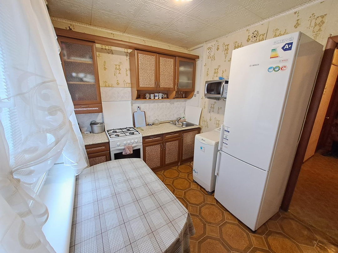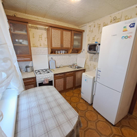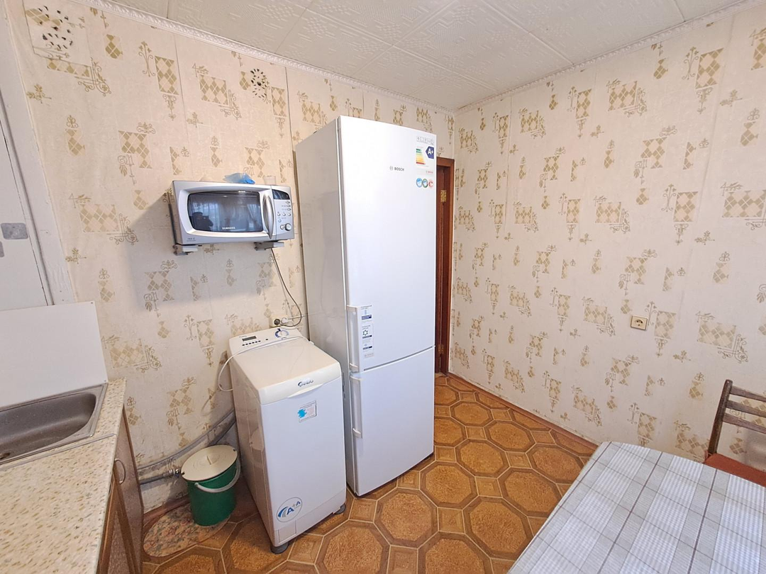 Из мебели и техника остаются: кухонный гарнитур, газовая плита, стиральная машина, кровать, маленький телевизор, большой вместительный шкаф в коридоре, стенка, комод, раскладной диван, два кресла, кондиционер.