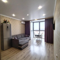 Просторная кухня-гостиная с эркером, мастер-спальня с гардеробной и лоджией, два санузла и две сплит-системы. В каждой квартире установлены индивидуальные теплосчетчики, что позволяет экономить на коммунальных услугах. Из техники остаются все приборы, кроме микроволновой печи и телевизора в гостиной.