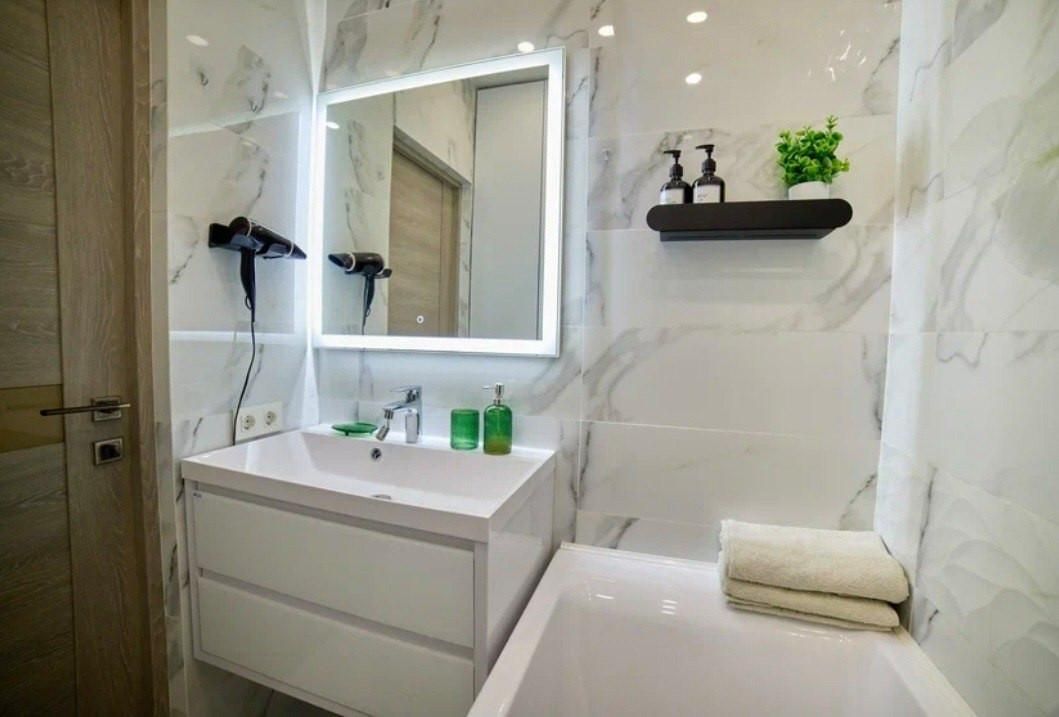 Квартира со стильным современным ремонтом, на полу ламинат высокого класса, санузел облицован керамогранитом, установлена качественная сантехника.