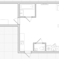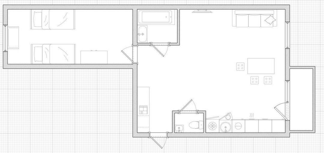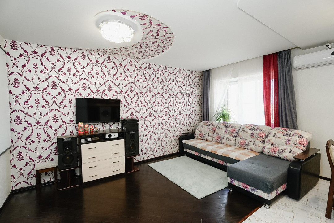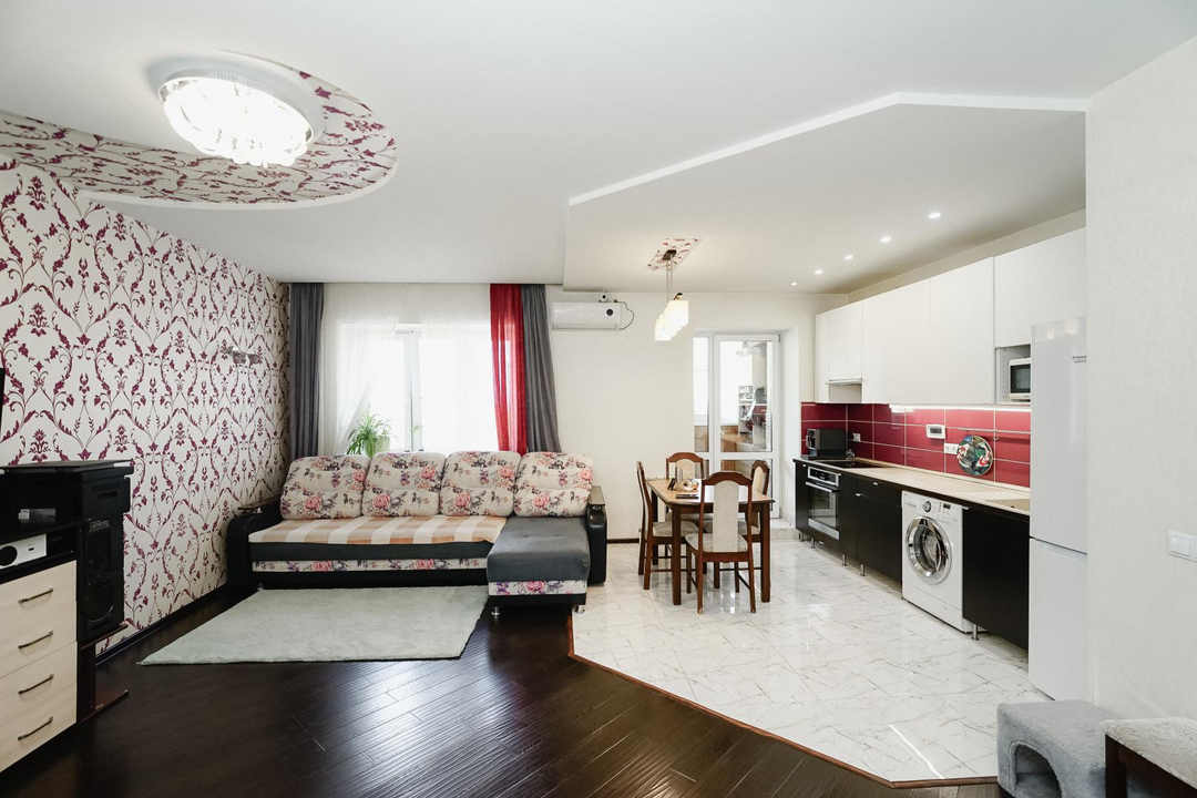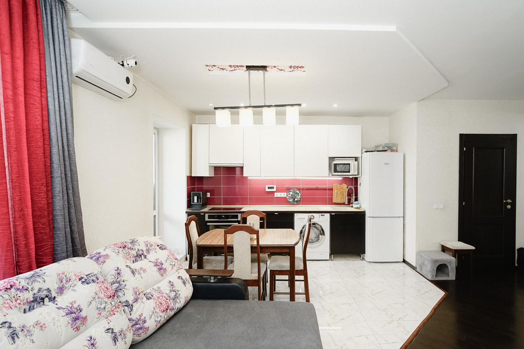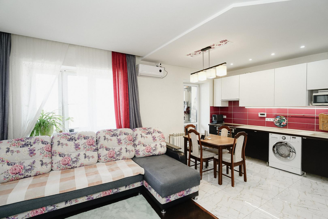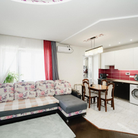 Квартира имеет эргономичную планировку с комнатой-кухней площадью 34,4 м² и дополнительной комнатой 15,5 м². Раздельный санузел. Окна ПВХ в зале и кухне обеспечивают естественное освещение с двух сторон. На полу в жилых зонах ламинат, в зоне кухонного гарнитура плитка. Установлены натяжные потолки.