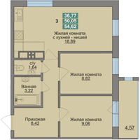 Про квартиру: Квартира общей площадью 54,62 м2. Находится на 7 этаже. Шикарная планировка, просторная кухня-гостиная - 18,89 м2, две спальни по 9 м2 каждая, раздельный санузел и большая прихожая. Есть застекленная лоджия, площадью 5 м2