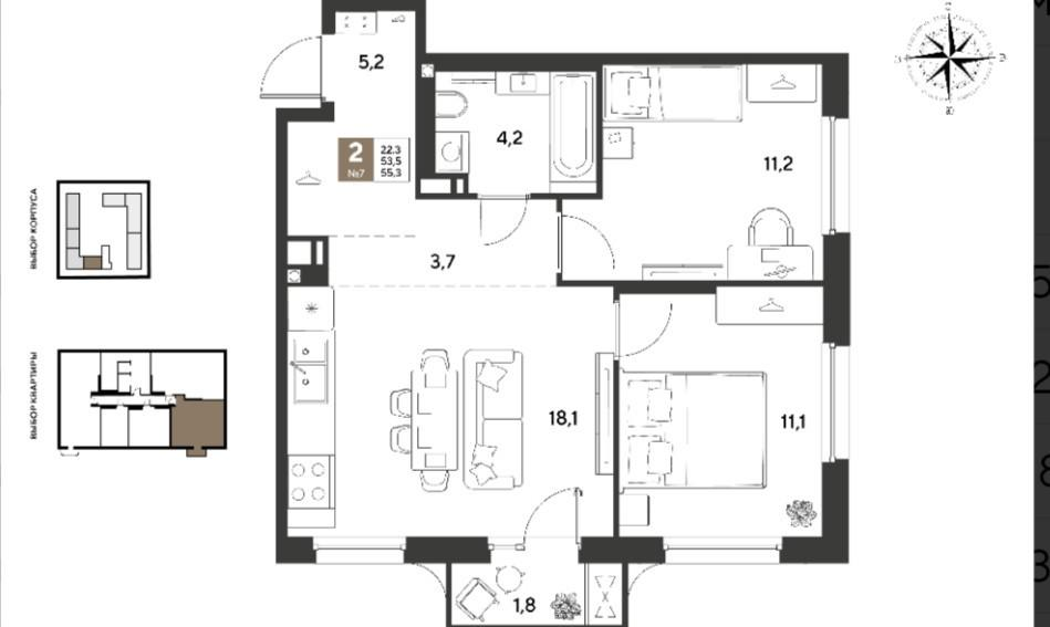 2 комн квартира с большой кухней гостиной.