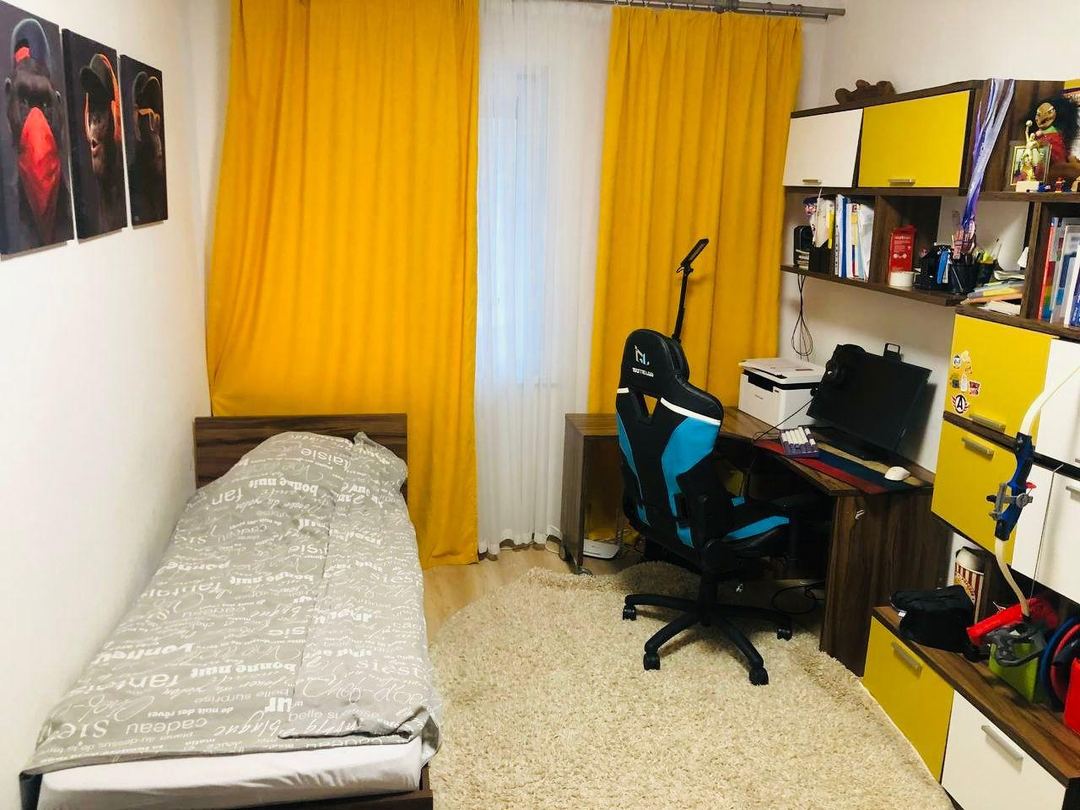 Удобная планировка комнат позволяет обустроить спальню и детскую комнату раздельно, обеспечивая каждому жильцу личное пространство.
