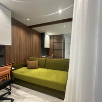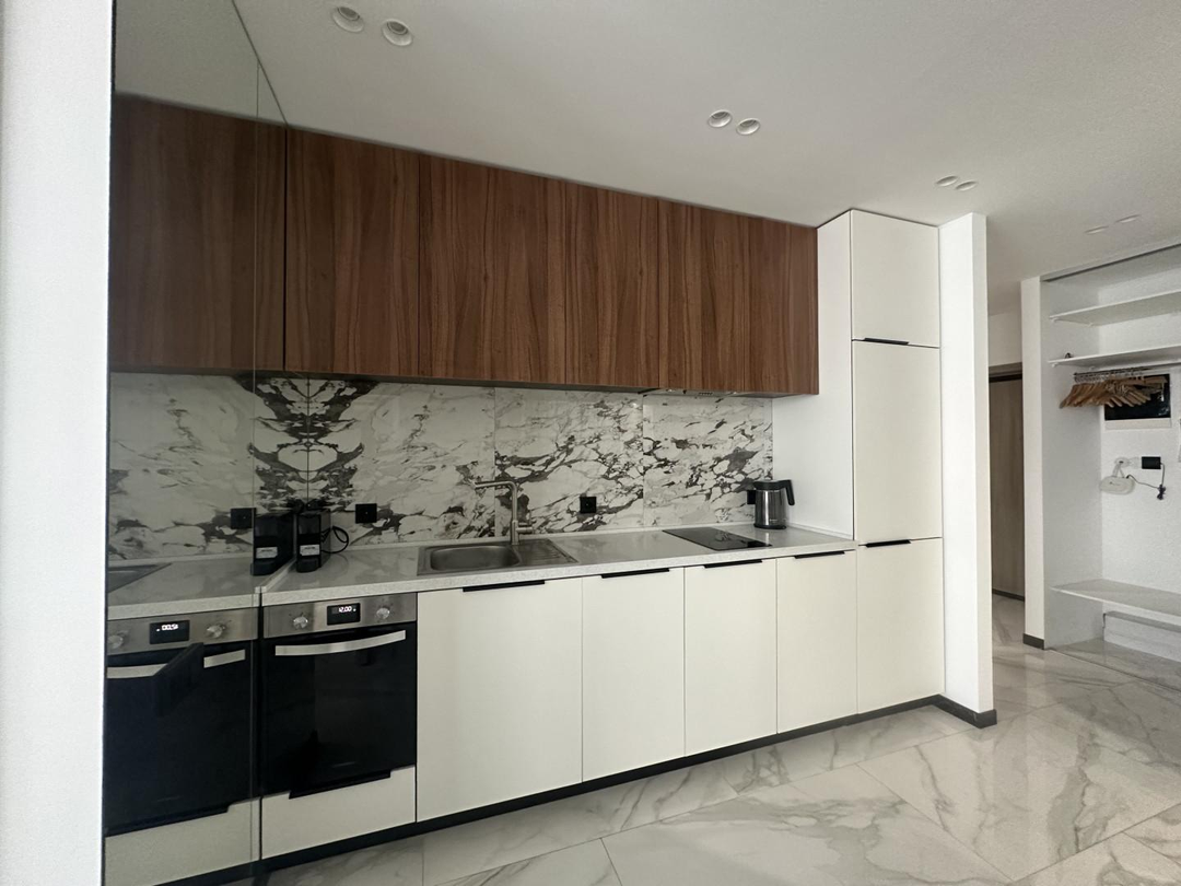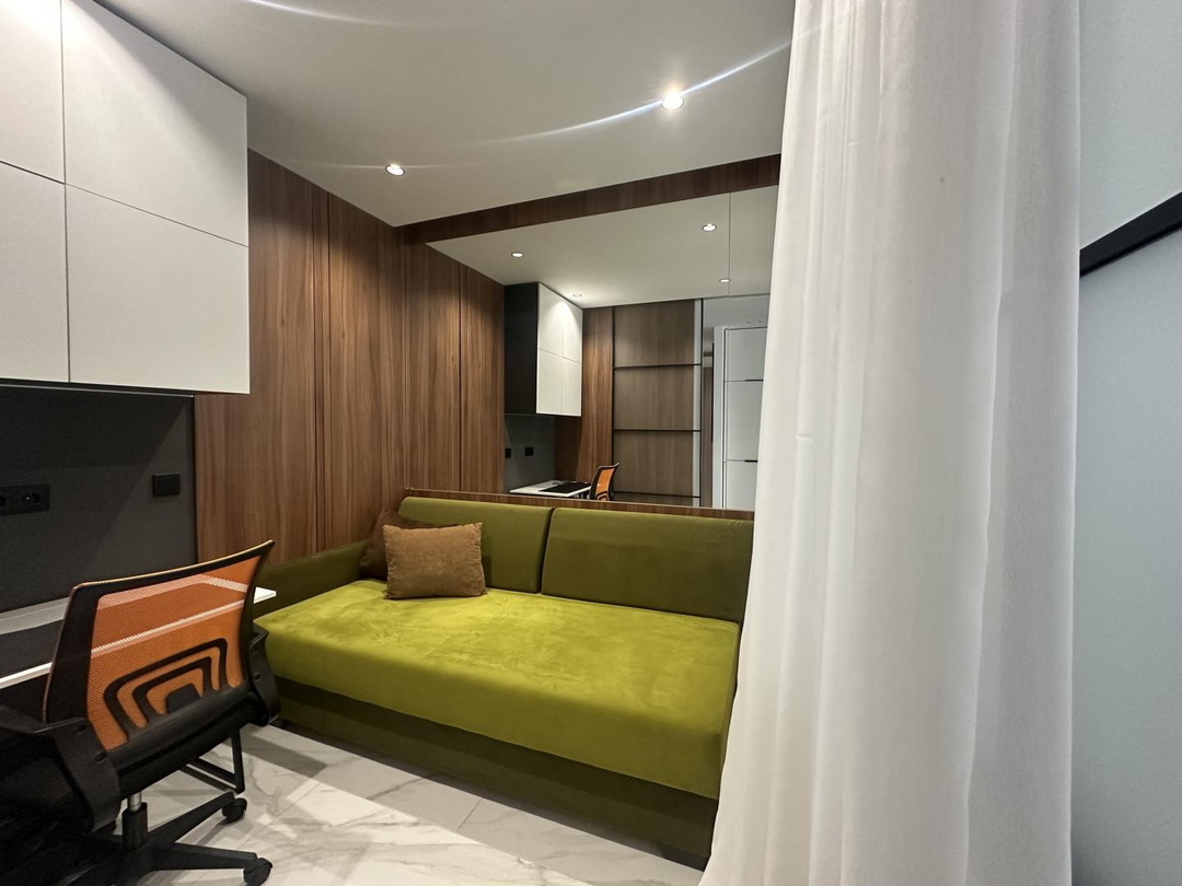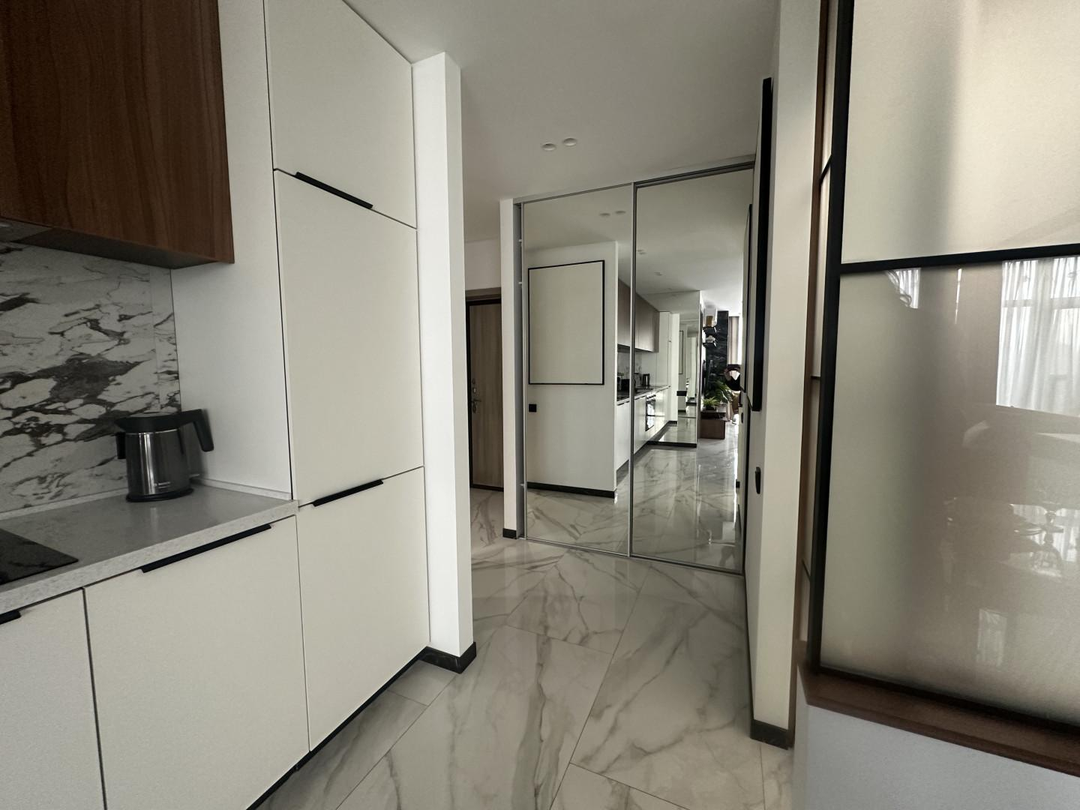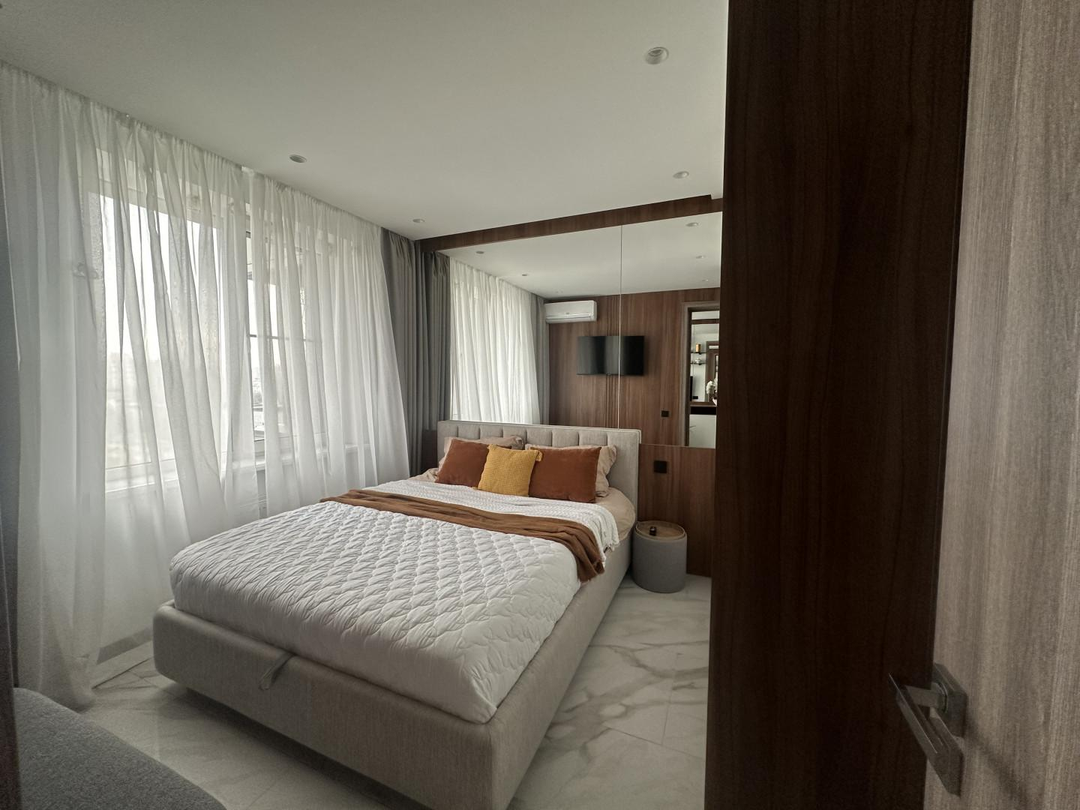 В квартире выполнен шикарный высококачественный ремонт из дорогих материалов под строгим руководством дизайнера! Продумано все до мелочей. Просторная кухня — гостинная, спальня и кабинет. Одна спальня с двухспальной кроватью и вместительным шкафом. Другая спальня небольшая с диваном для гостей, а также можно использовать ее как детскую.