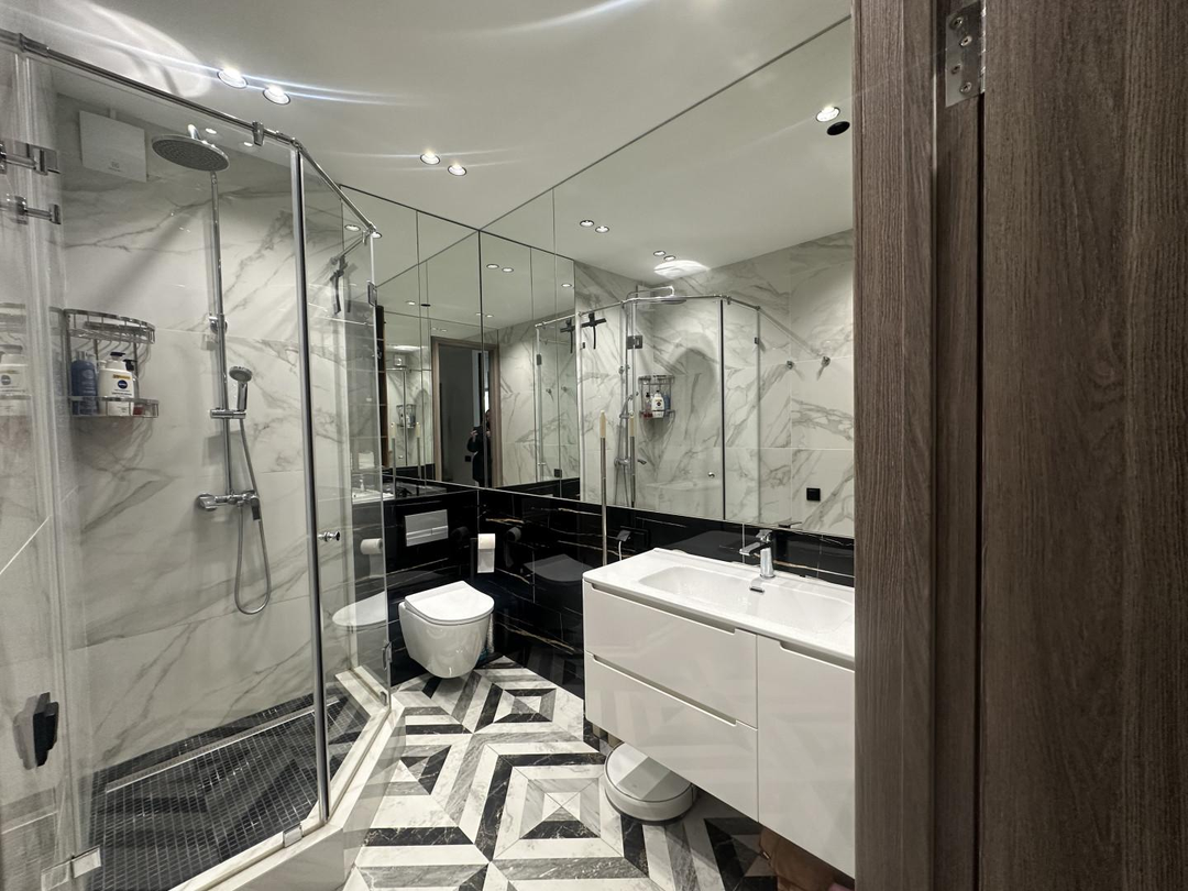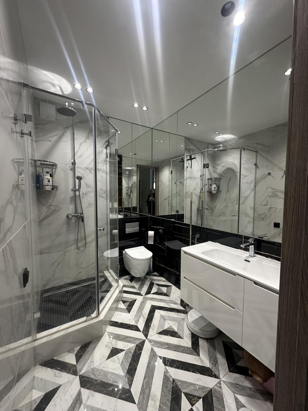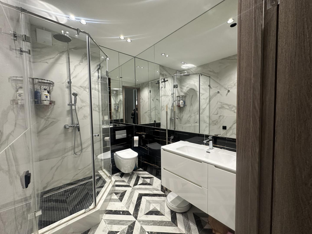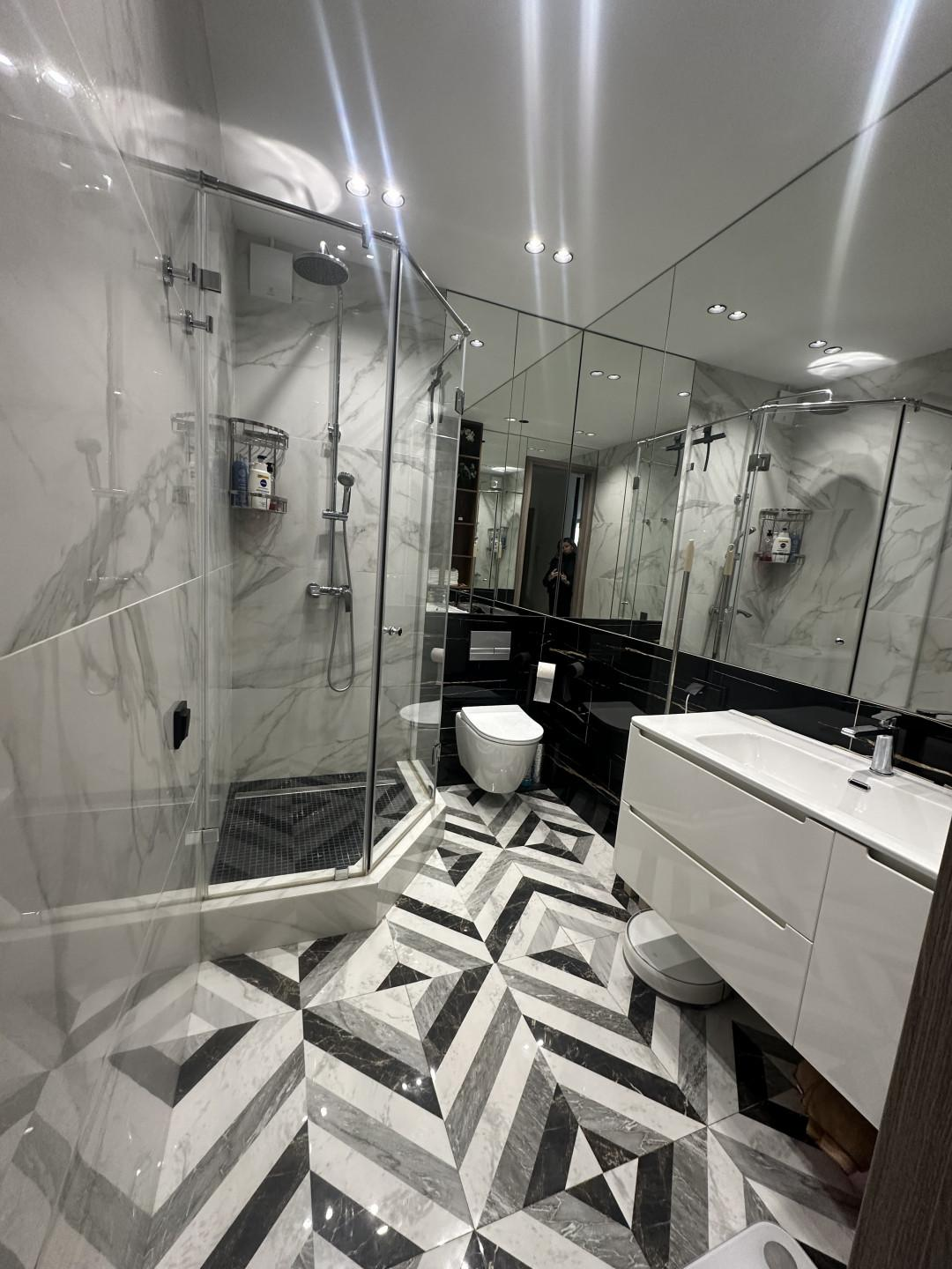 Совмещенный сан-узел с душевой кабиной.Все выполнено в одном стиле. Очень стильно, модно и современно! В квартире остается вся техника и мебель! Заходи и живи.