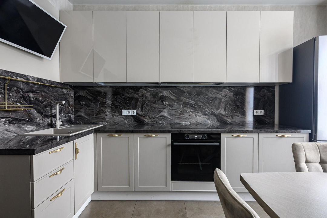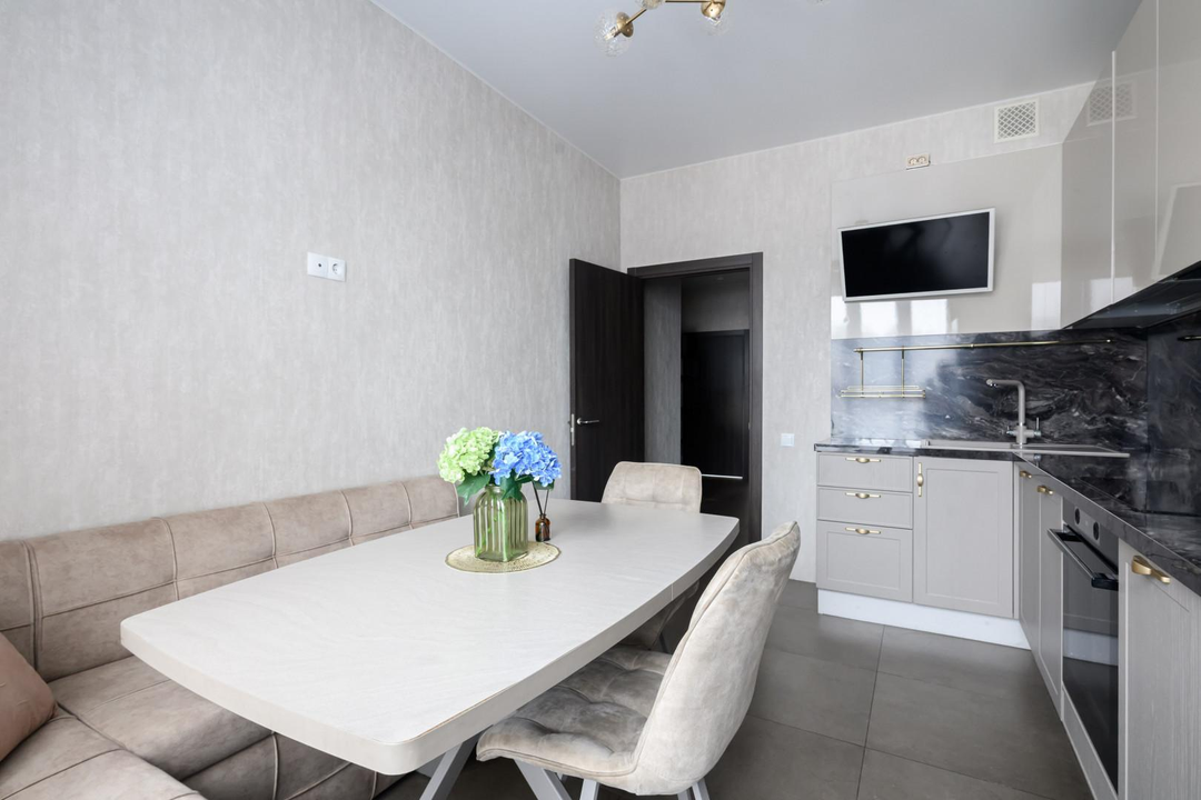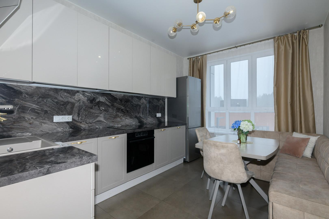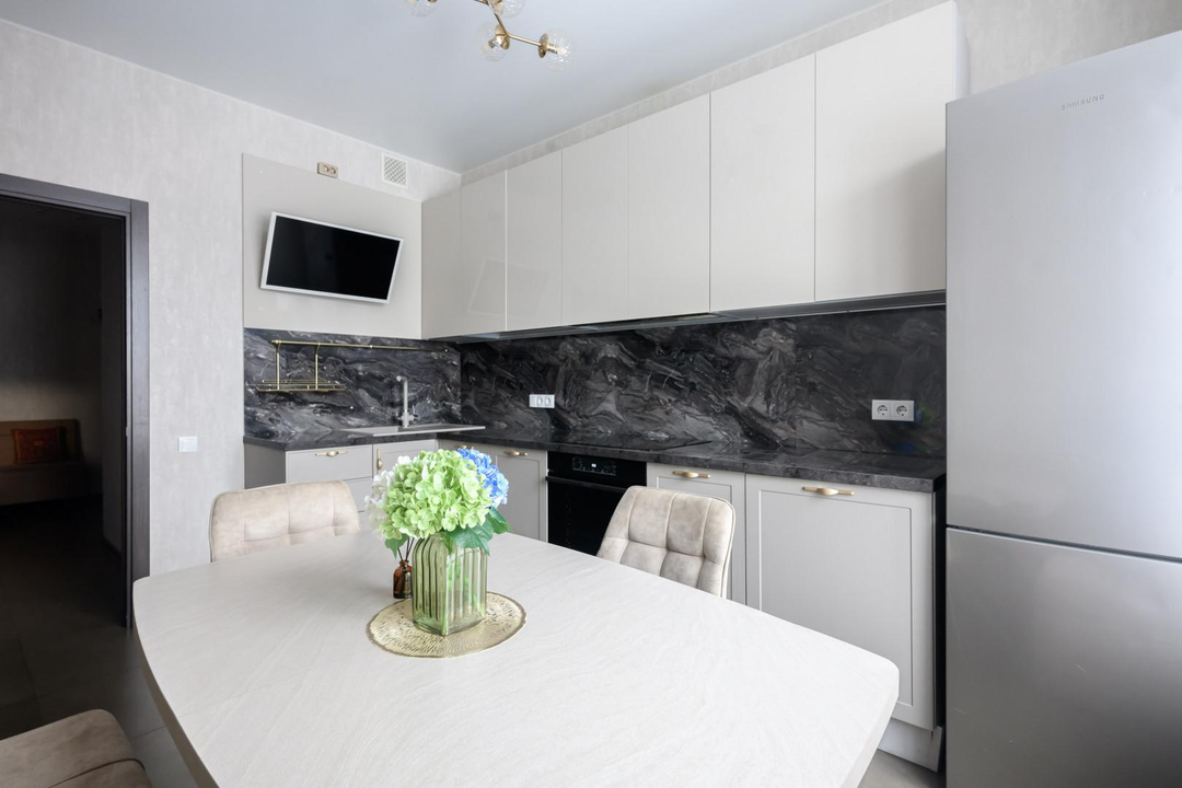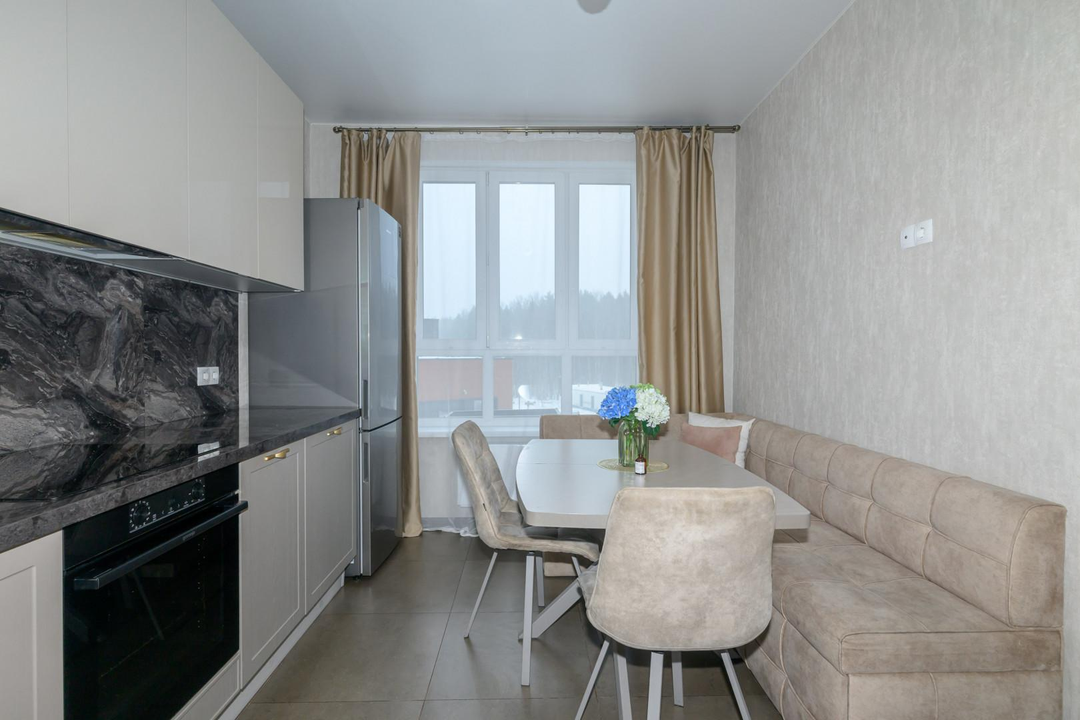 Бонус: Остается встроенная кухня фирмы «Мария» со всей необходимой встроенной бытовой техникой.