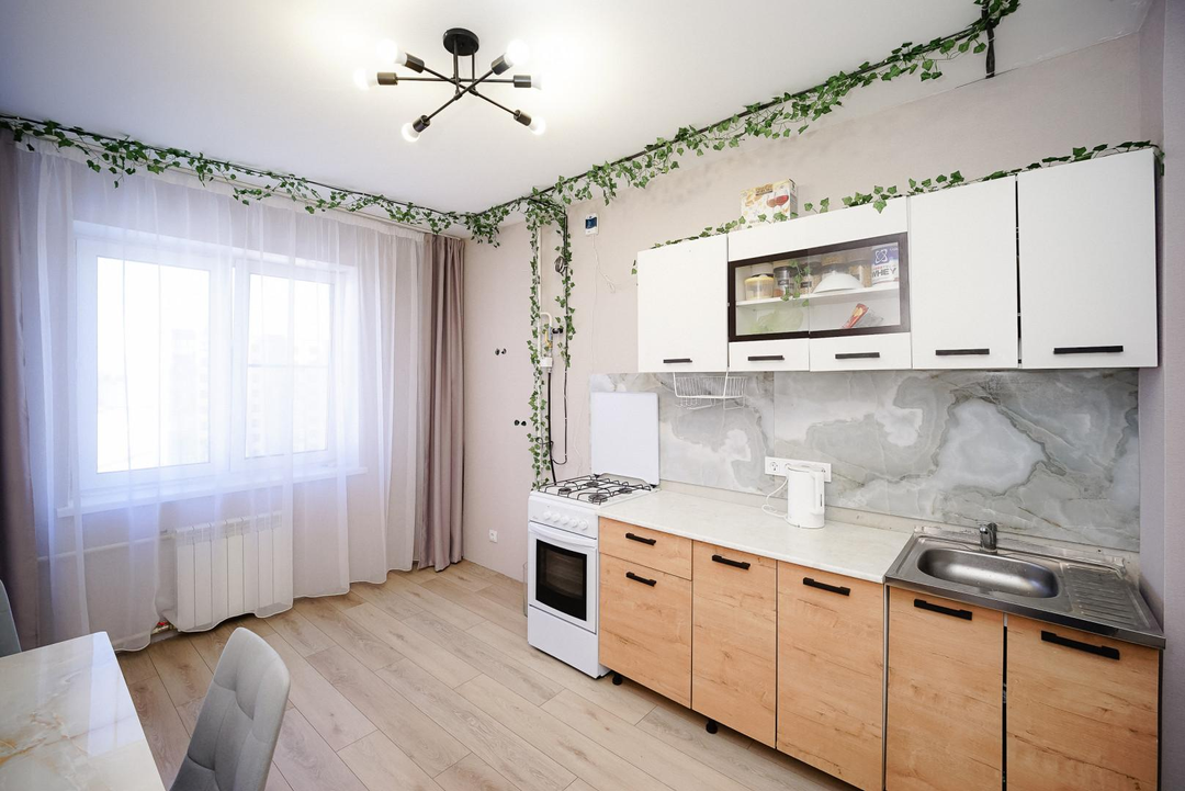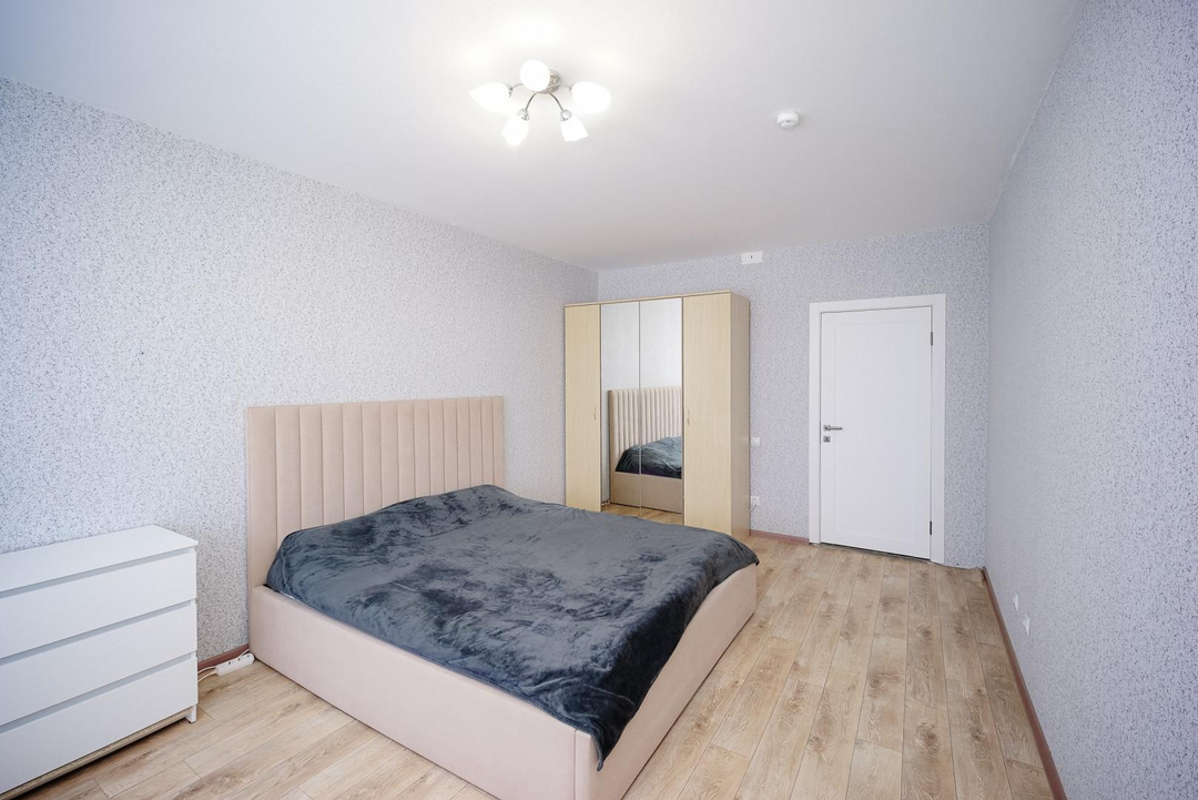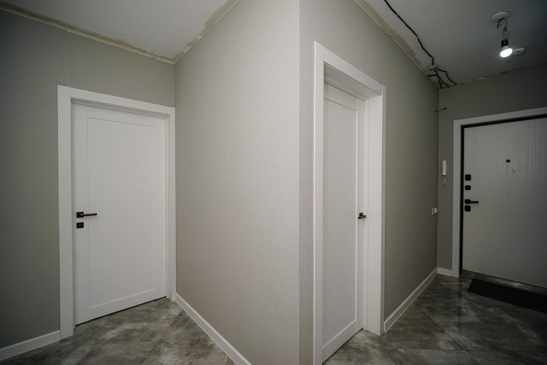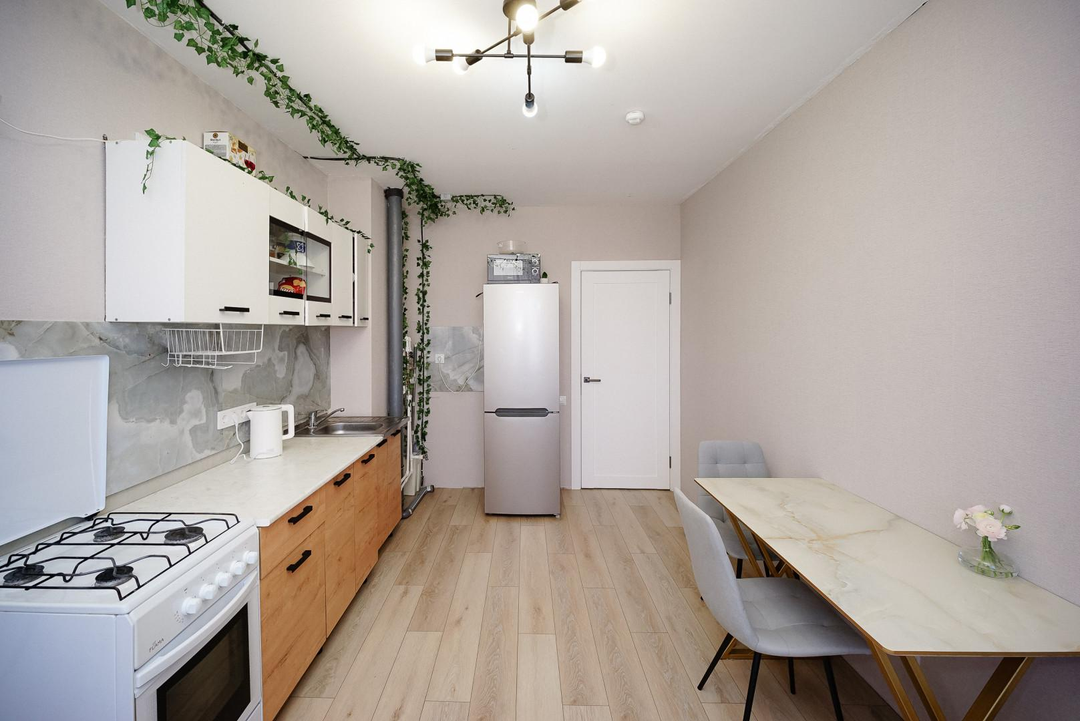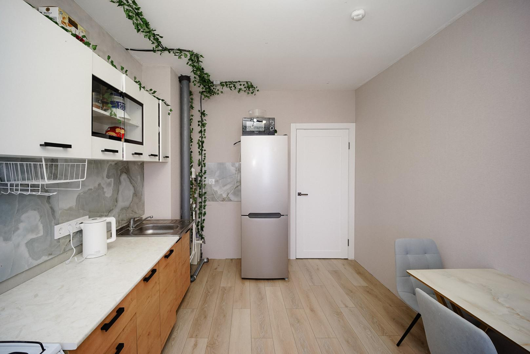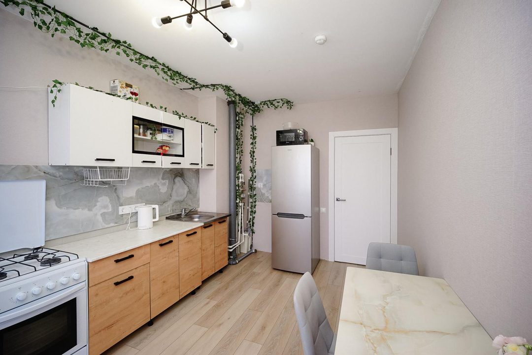 тёплый пол с датчиком (в ванной и коридоре);кварц‑винил на полу, выровнен под уровень;новые обои и плитка по всей квартире;встроенная мебель на заказ остается;кухонный гарнитур;современная техника: стиральная машина, водонагреватель, электрический полотенцесушитель;система «Умный дом» (подъезд, площадка);новые радиаторы и трубы;натяжные потолки.