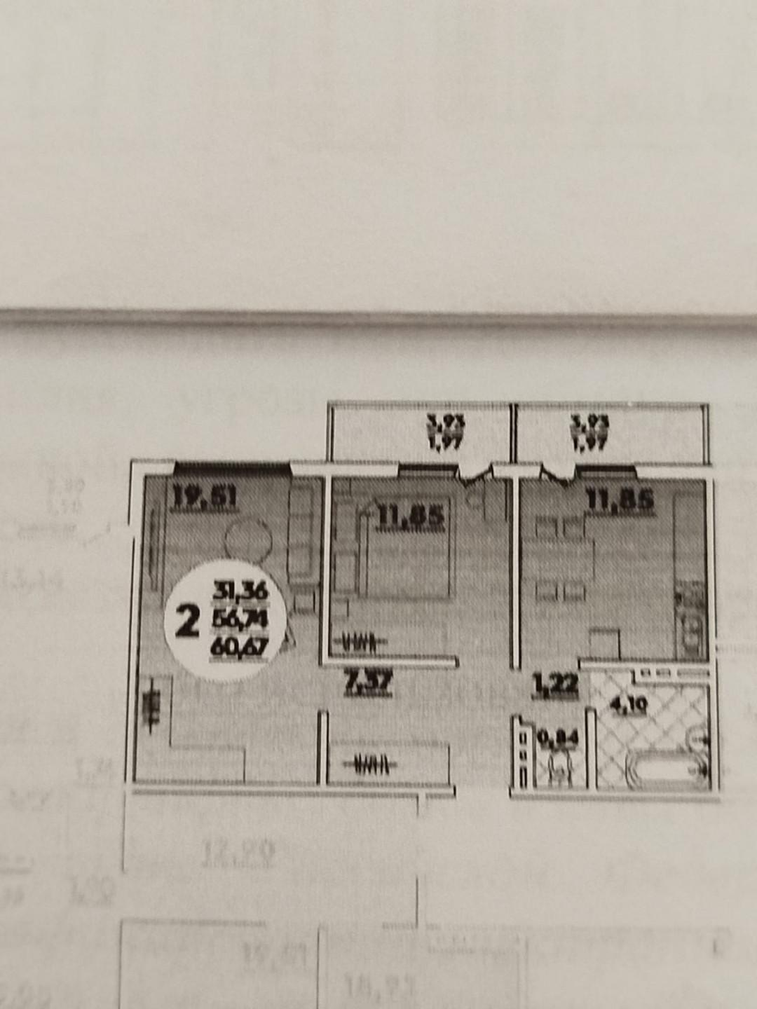 Общая площадь 56,74м²: кухня 11,85м², комната 11,85м², гостиная 19,51м², санузел 4,1м², кладовая 0,84м², коридор 7,57м², 2 лоджии по 3,93м²;В квартире выполнен евроремонт, 2 большие лоджии совмещенные с комнатой и кухней, откуда открывается вид на внутренний двор;В квартире остается вся мебель, из техники остаются: 2 сплит системы, варочная панель.