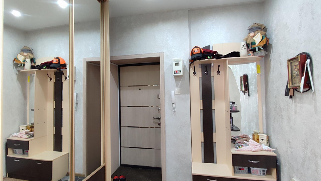Просторная прихожая площадью 6,9 м², уютная и стильная, оборудованная вместительным встроенным шкафом купе.