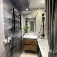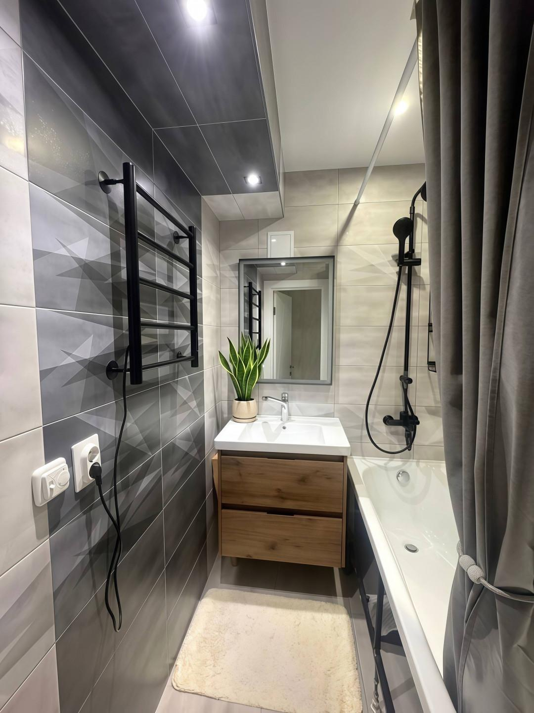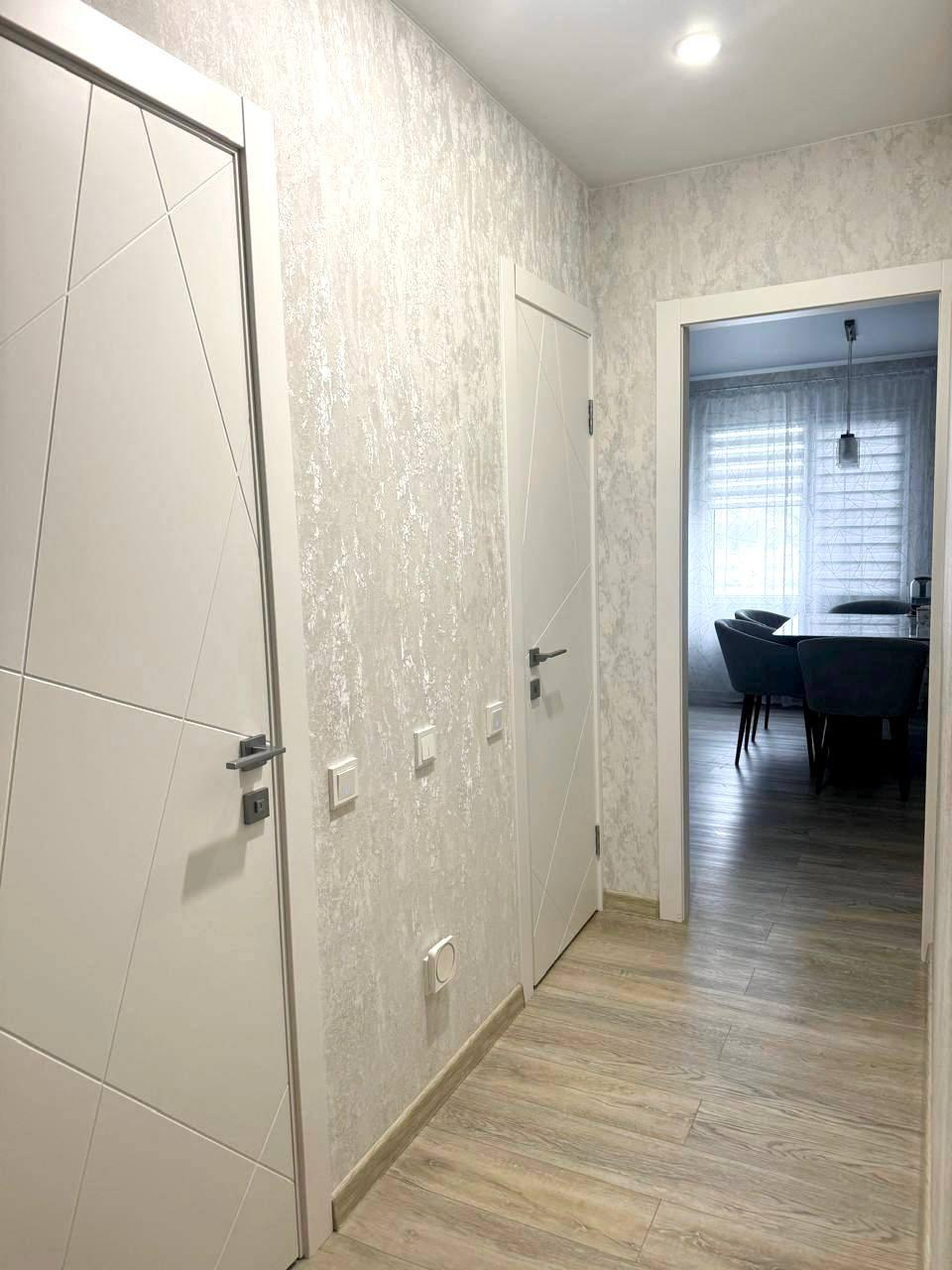В квартире выполнен дизайнерский ремонт: установлены пластиковые окна, натяжные потолки с точечными светильниками, стены выровнены по маякам и оклеены качественными обоями. Полы стяжка, на полу ламинат TARKETT 34 класса . Раздельный санузел оформлен в современном кафеле. Входная металлическая дверь гарантирует безопасность и защиту.