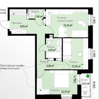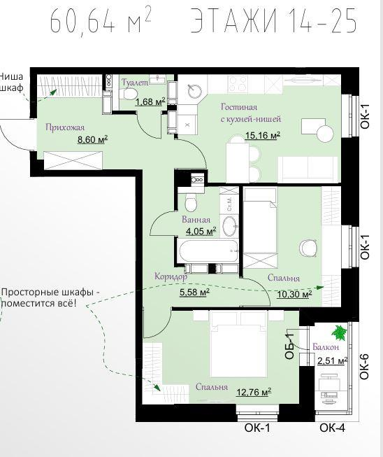 Общая площадь 60,64 м2