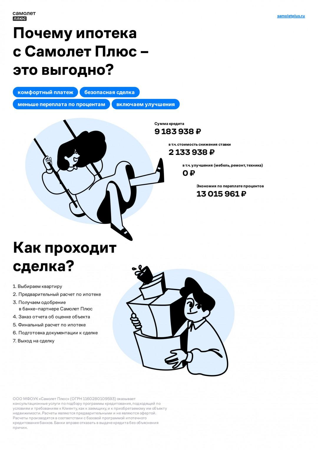Покупая квартиру с компанией Самолет Плюс, вы получаете:безопасность сделки,максимально выгодную ставку по ипотечному кредитованию.