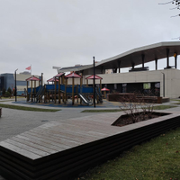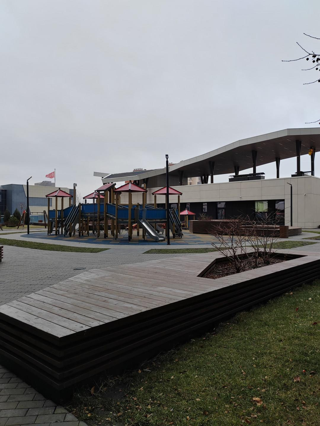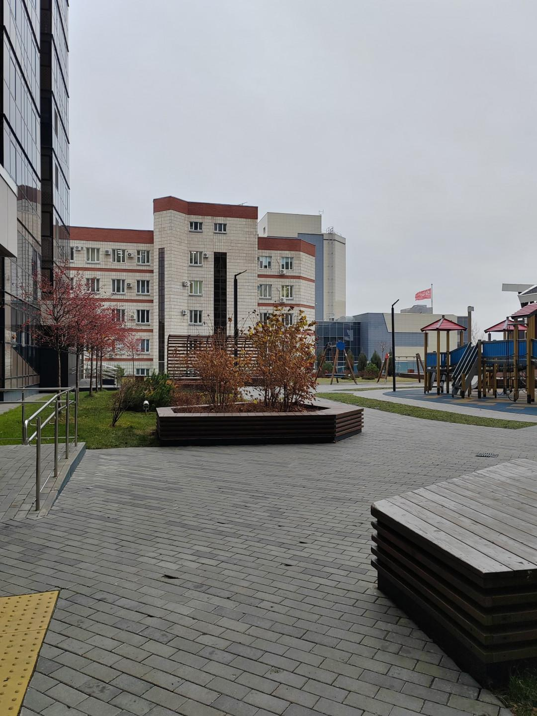Закрытый двор на стилобате с современными детскими и спортивными зонами.