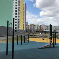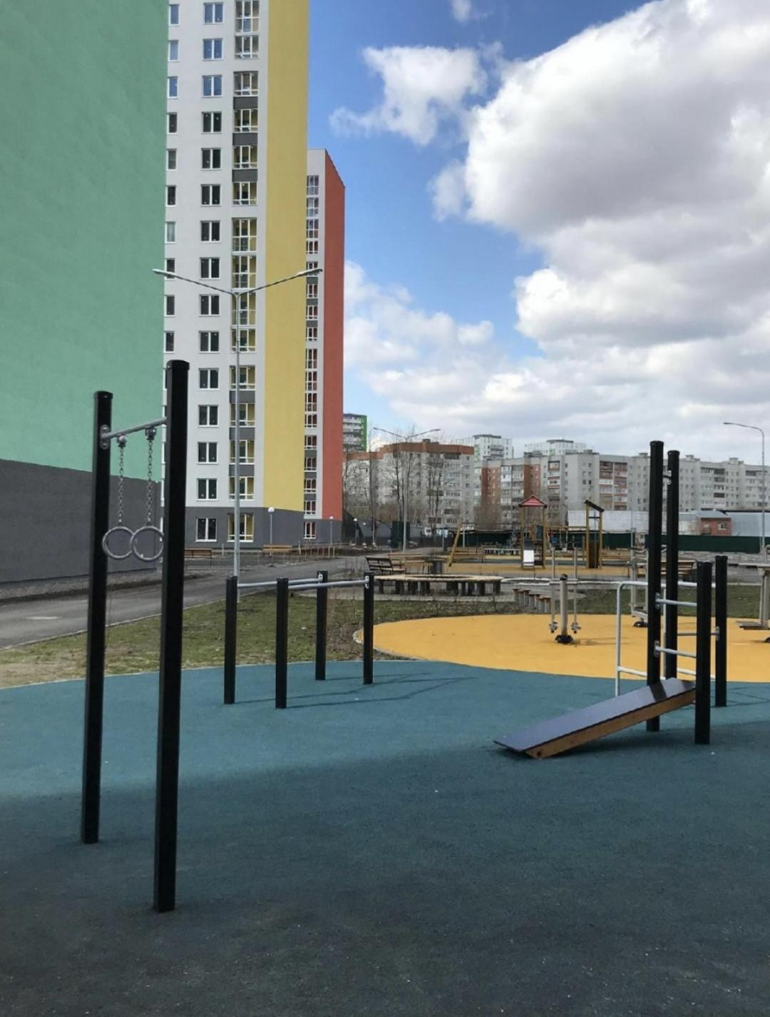 Закрытая территория с видеонаблюдениемДетская площадка с резиновым покрытиемСпортивные зоныЗоны отдыха с озеленением Пешеходные дорожки со скамейками