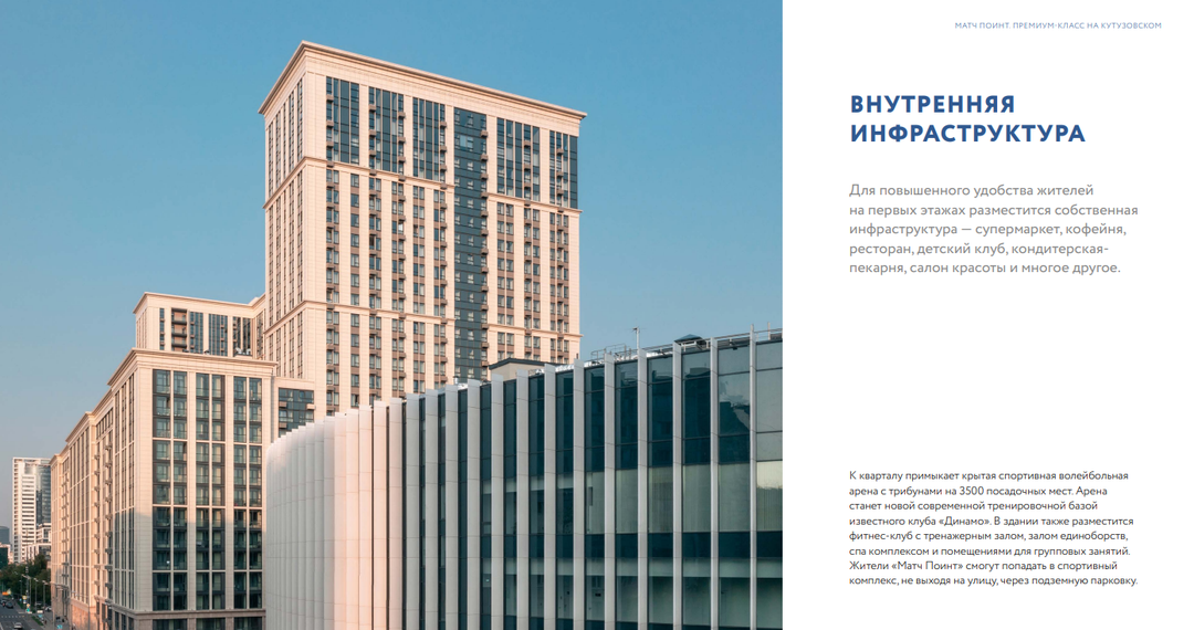 Матч-поинт - комплекс апартаментов рядом с парком Победы, идеален для тех, кто хочет в полной мере ощутить динамику столичной жизни. Соответствуя духу места, квартал переосмысляет архитектурные традиции Кутузовского проспекта в современном ключе. Зелёный двор без машин, подземный 3х уровневый паркинг, рассчитан на 1600 мест, конференц-залы и уютные кофейни позволяют и жить и работать , не выходя за пределы комплекса.