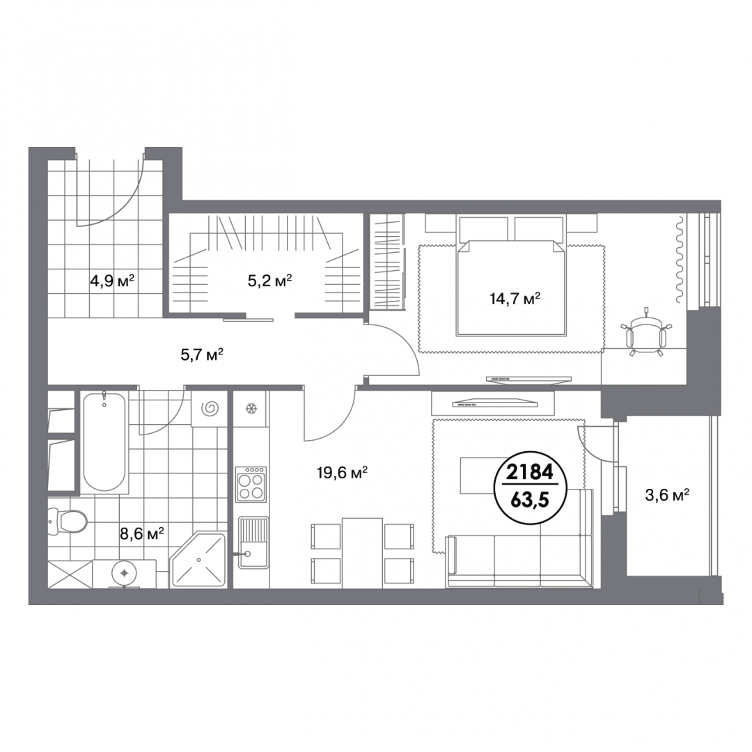 Вариант планировочного решения: Кухня-гостиная 19,6 м² — уютная зона для встреч с близкими. Две спальни — 14,7 и 19,6 м² — комфортные помещения для отдыха. Коридор 5,2 м² и прихожая 4,9 м² обеспечивают комфортную организацию пространства. Высота потолков 3,05 м создаёт ощущение воздуха и простора.