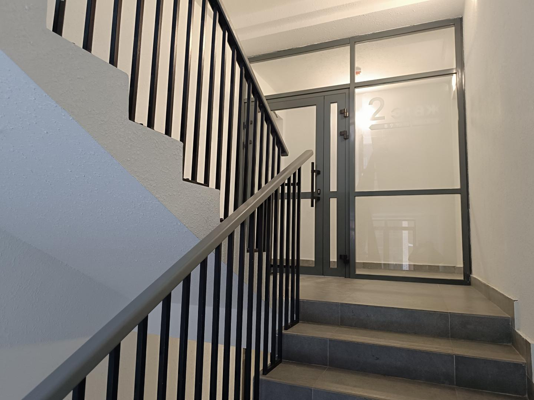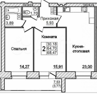 Расположена на 2-м этаже, окна выходят на улицу. Общая площадь квартиры - 64.4 кв.м. Площадь комнат: 14 м2, 16 м2. площадь кухни-гостинной 23 м2.