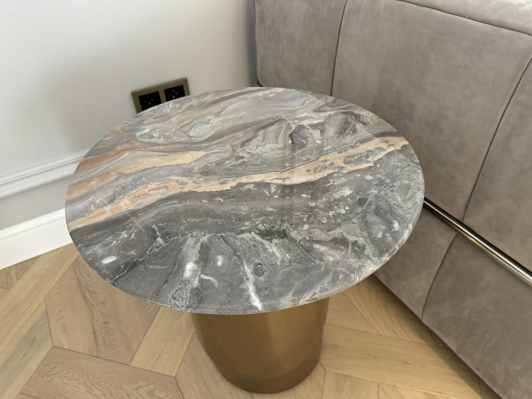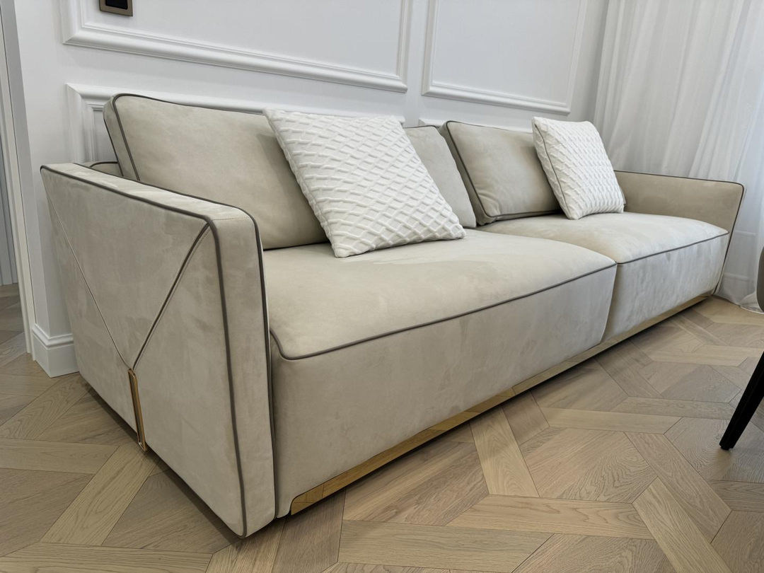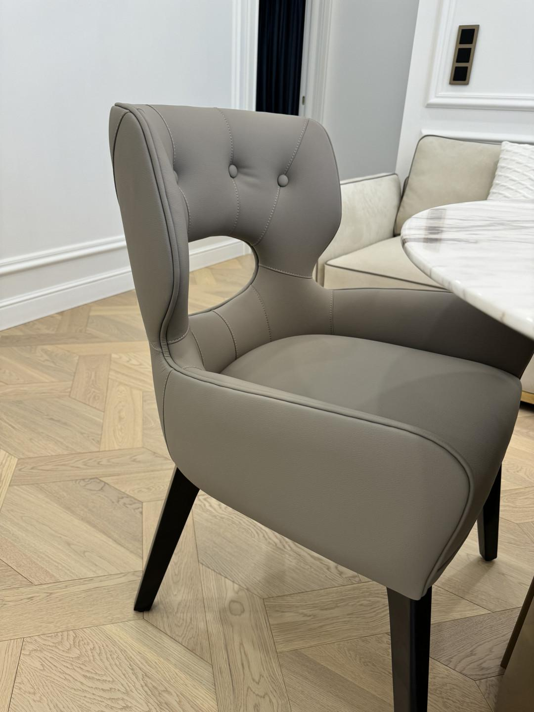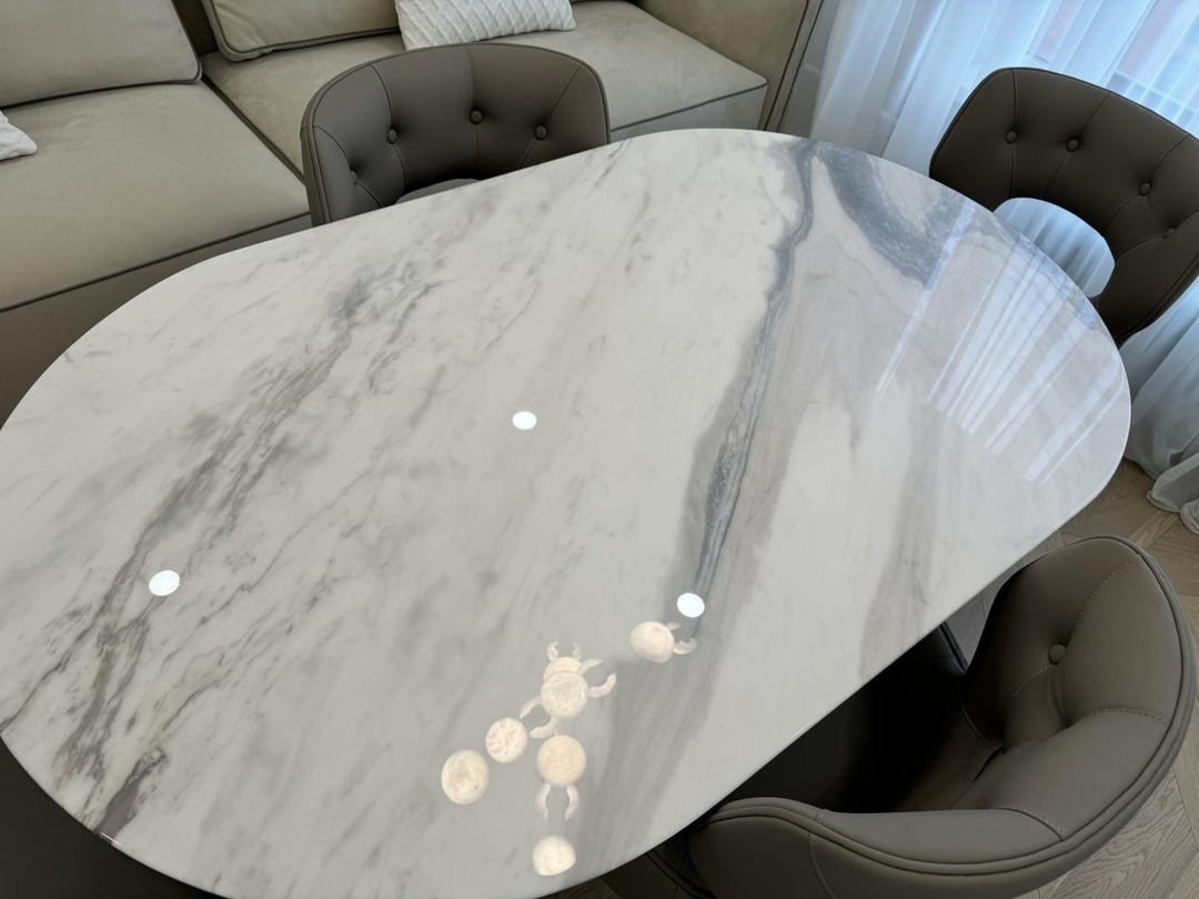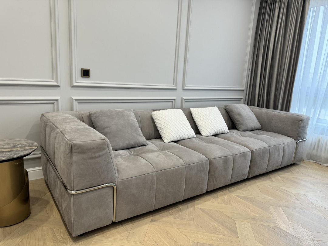В гостиной имеется обеденный стол, выполнен из натурального белого мрамора с защитным покрытием в дополнении с кожаными комфортными стульями и 3-х метровым диваном(в стиле бренда Vissionaire) в дополнении с роскошной люстрой. Стильный серый диван из нежнейшего нубука, чайный столик из натурального мрамора.