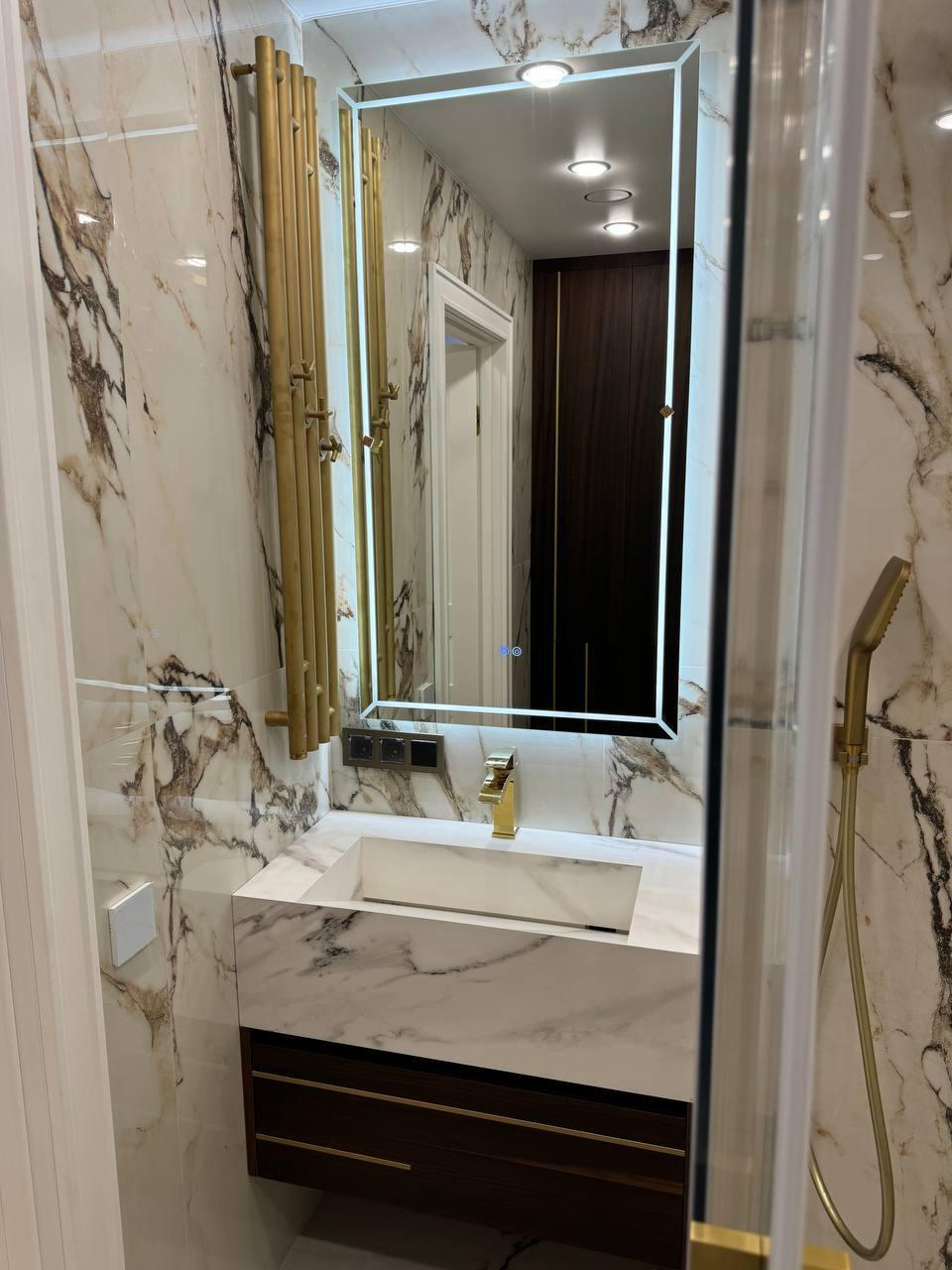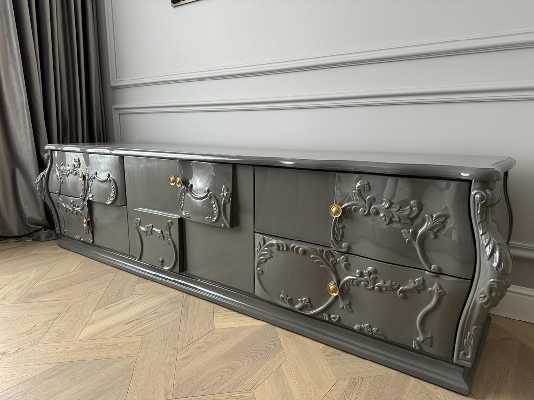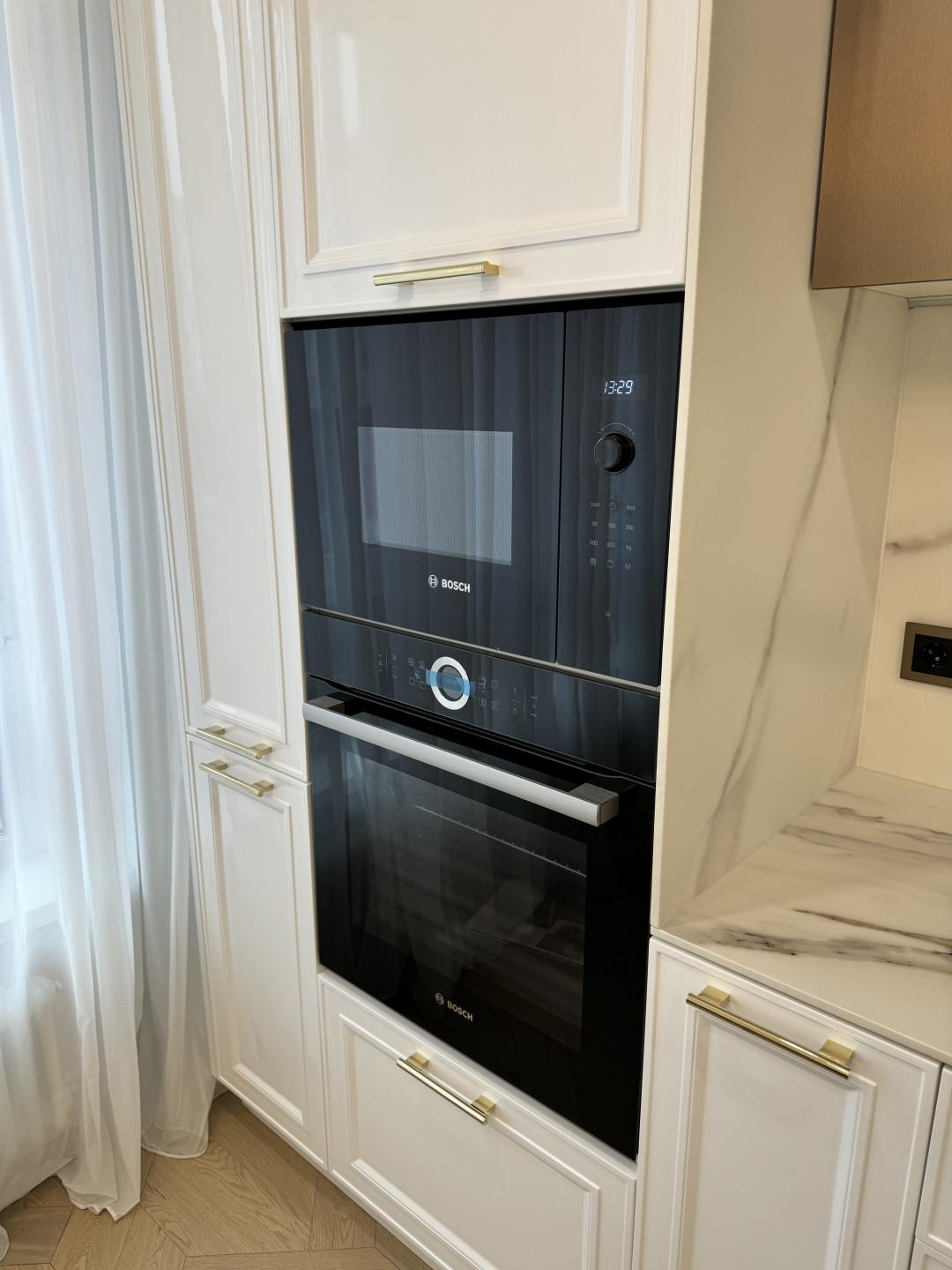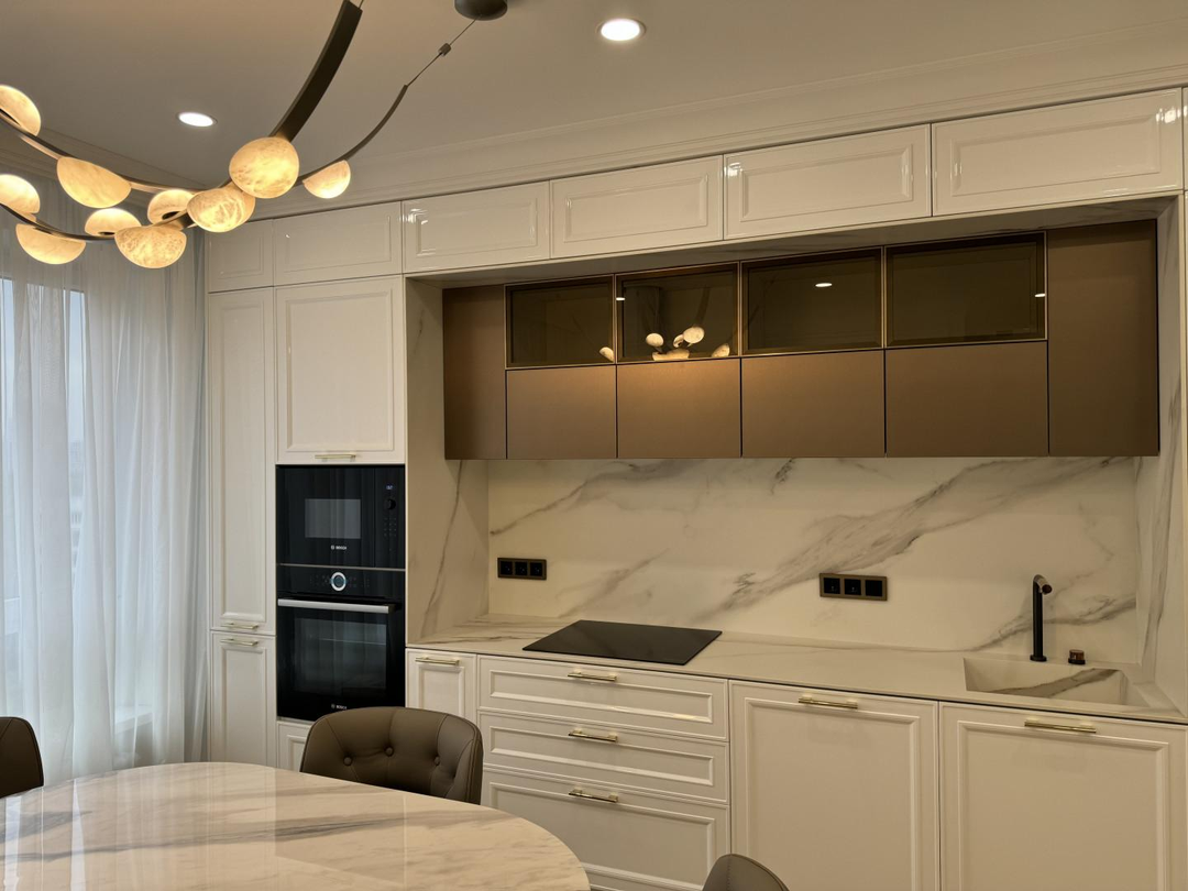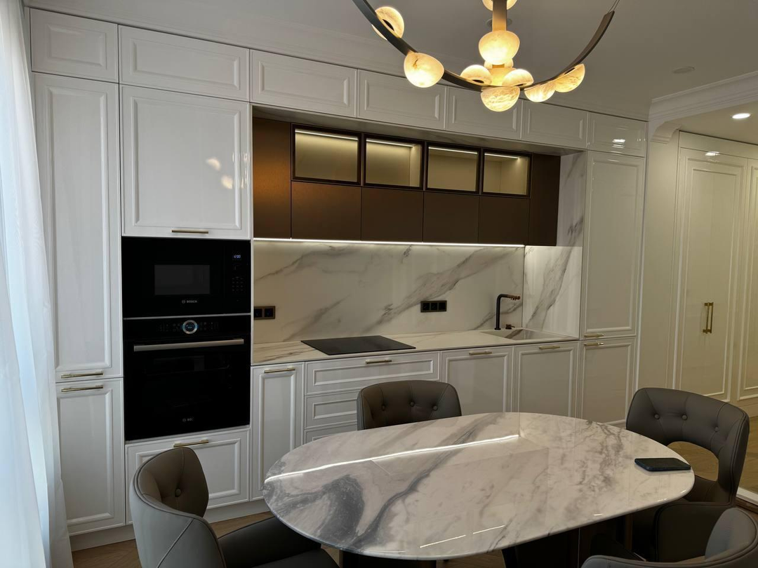 При входе Вас встречает 2-метровое зеркало, сложнейший декор которого, полностью выполнен из массива дерева, в ручную. Бренд Cristopher Guy. На стенах использовалась премиальная английская краска бренда Little green. - Вся мебель и свет в квартире, изготавливалась и была доставлена под заказ в лимитированном исполнении.Кухня оснащена множеством зон хранения - корзинами, системами хранения, ложментами, доводчиками, подсветками.