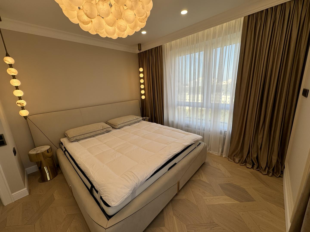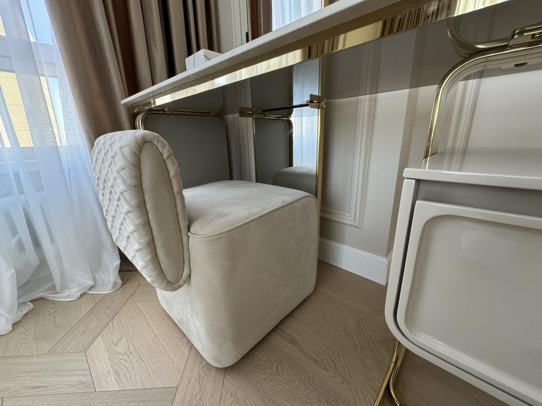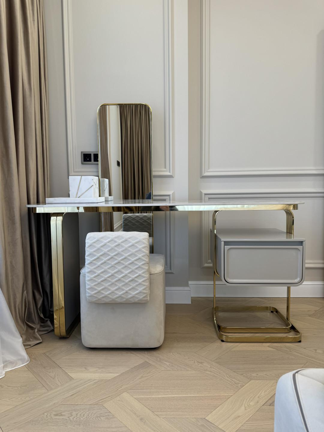Спальня - роскошная кровать с широким акцентным изголовьем в стиле Vissionaire, прикроватные тумбы и туалетный стол с зеркалом и пуфом. Матрац с топпером. Но самое ее большое украшение - это люстра из натурального мрамора состоящая из 93 мраморных шаров , в жизни выглядит особенно эффектно.