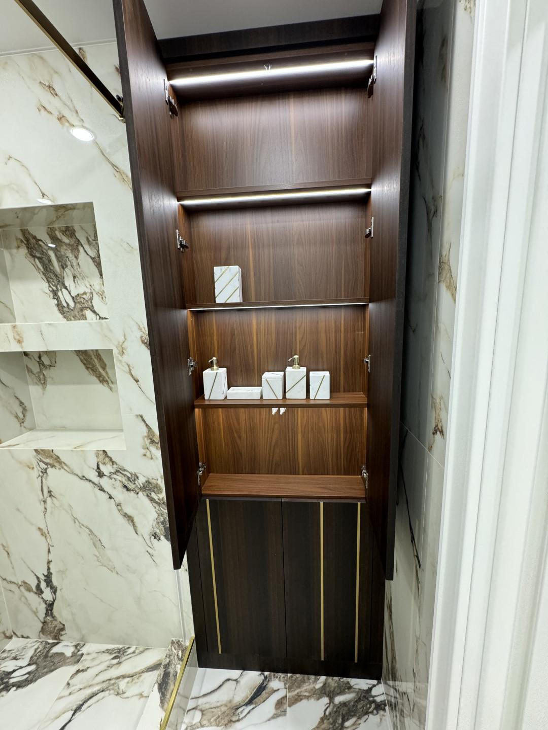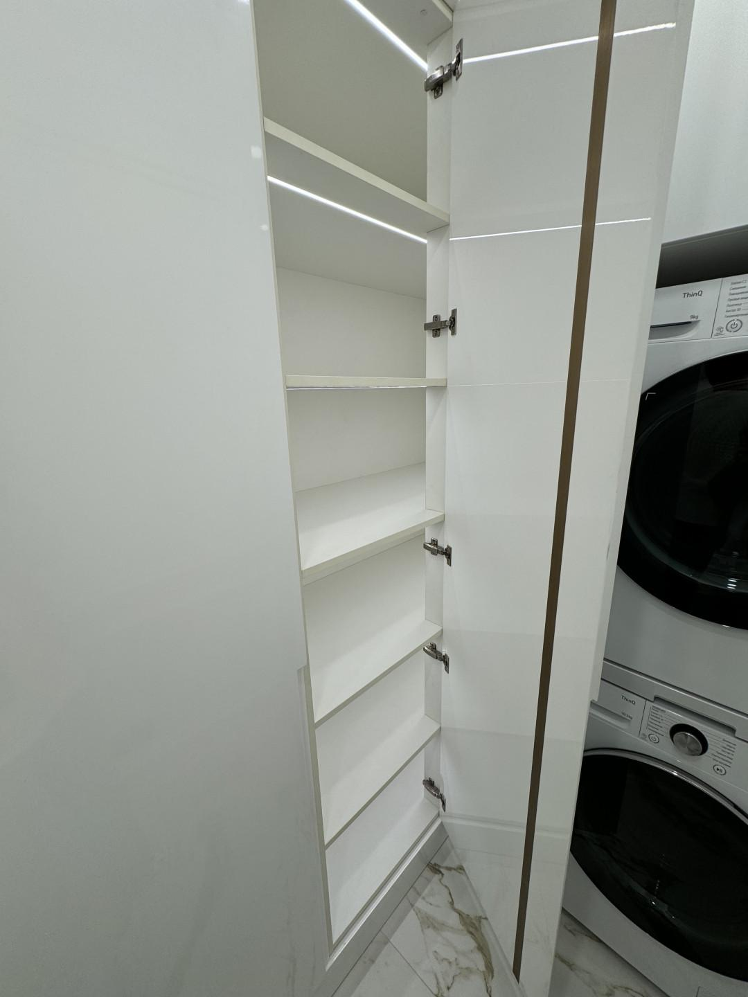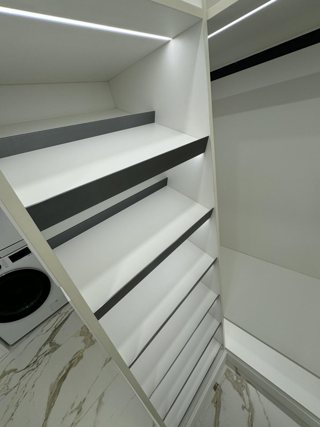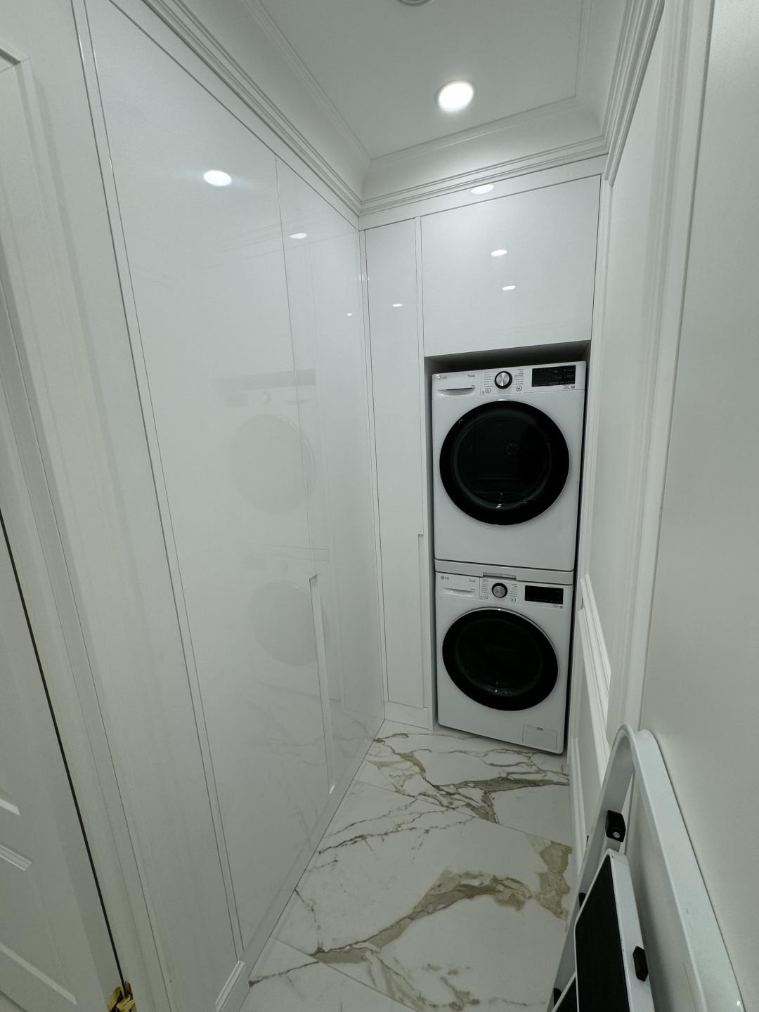 Постирочная - в которой предусмотрено: стиральная и сушильная машинки с вместительной зоной хранения. Также, в ней расположен гардероб для верхней одежды и зона хранения для обуви.