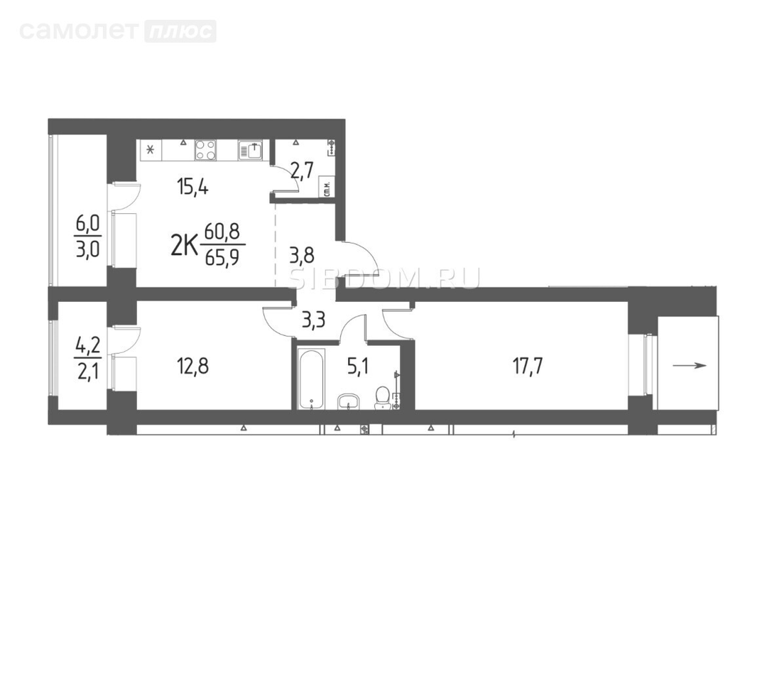 1 Комната - 17.7кв.м, 2 комната - 12.8кв.м, Кухня-гостиная -15.4 кв.м
