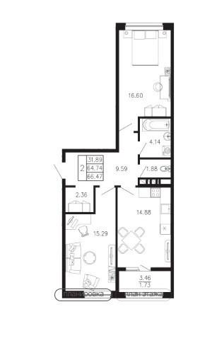 2-комнатная 66.5 м2 в ЖК undefined корпус null этаж 4