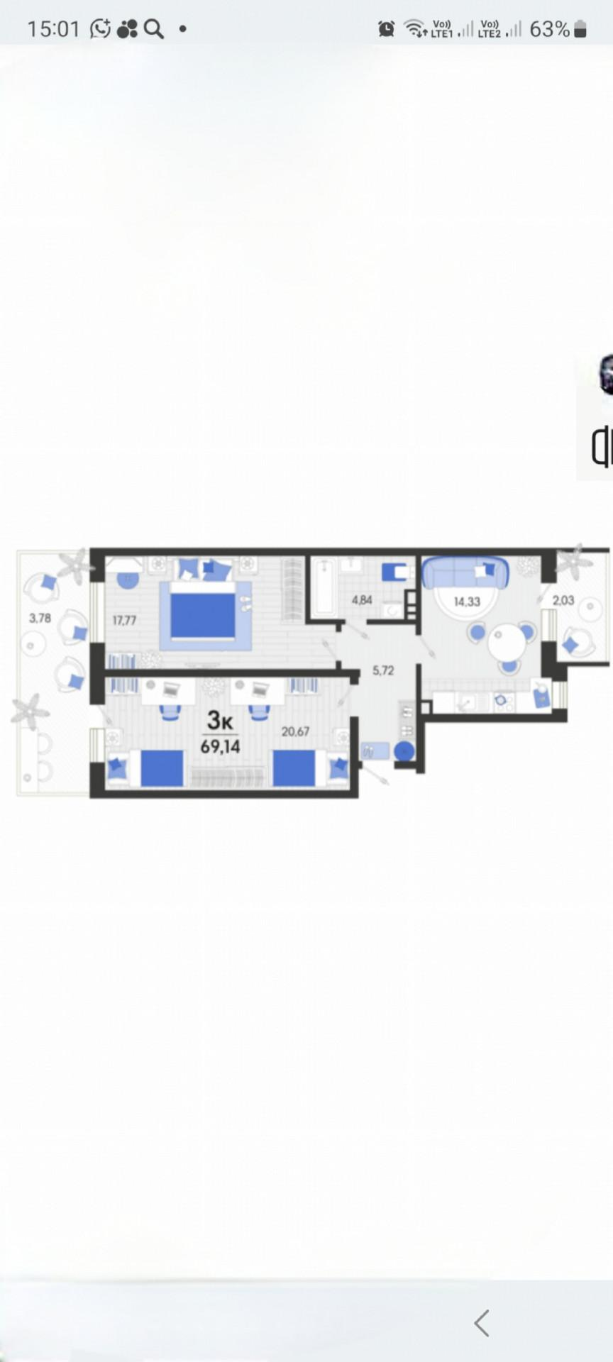 2-к. квартира, 69,1 м²