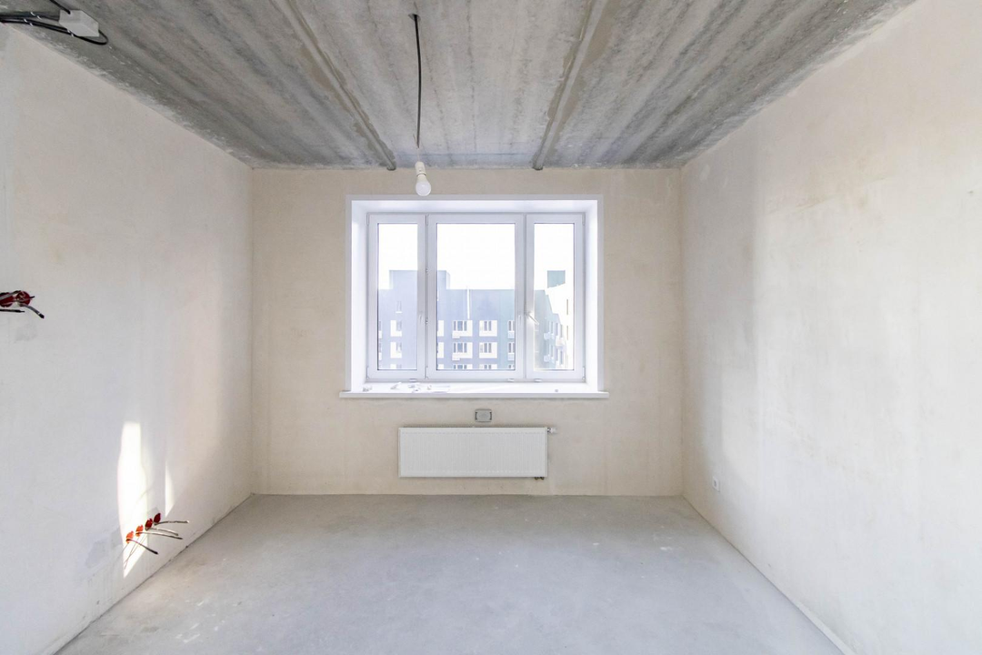 Квартира в предчистовой отделке: цементно-песчанная стяжка пола, стены отштукатурены и выровнены под маяк, электрика разведена по квартира, горизонтальная разводка отопления.