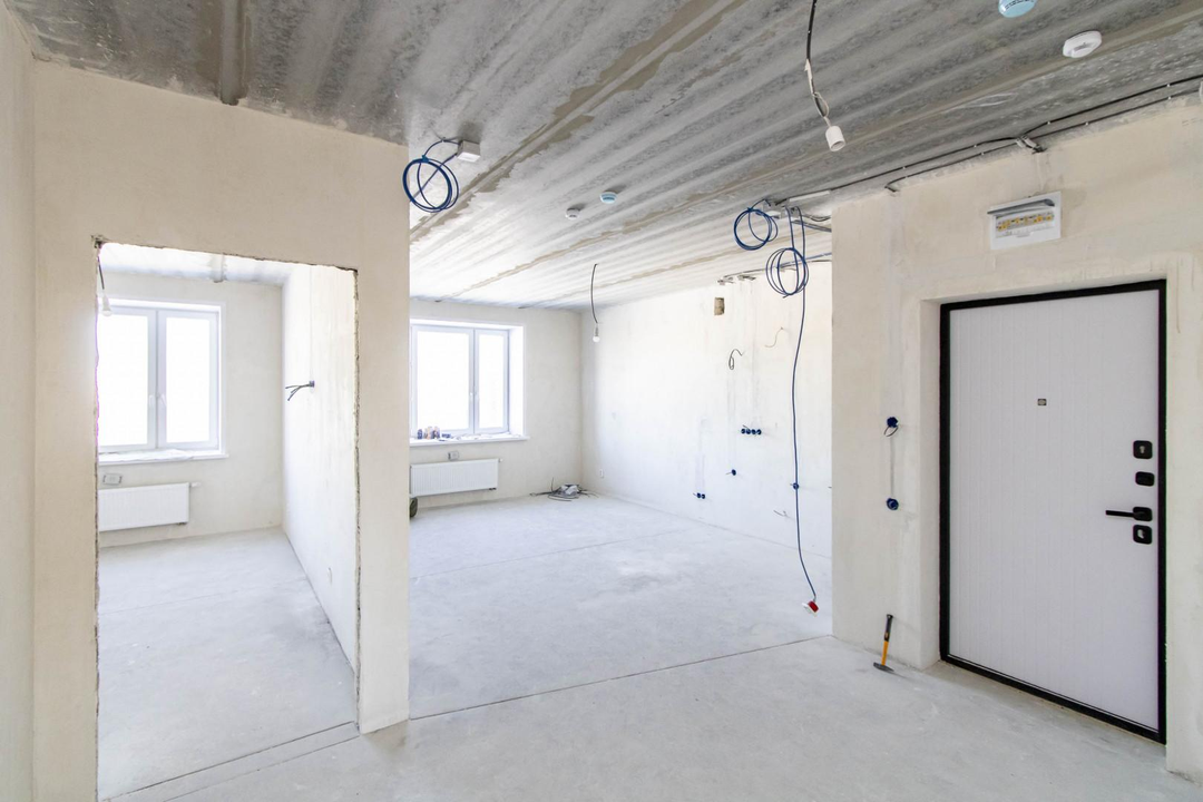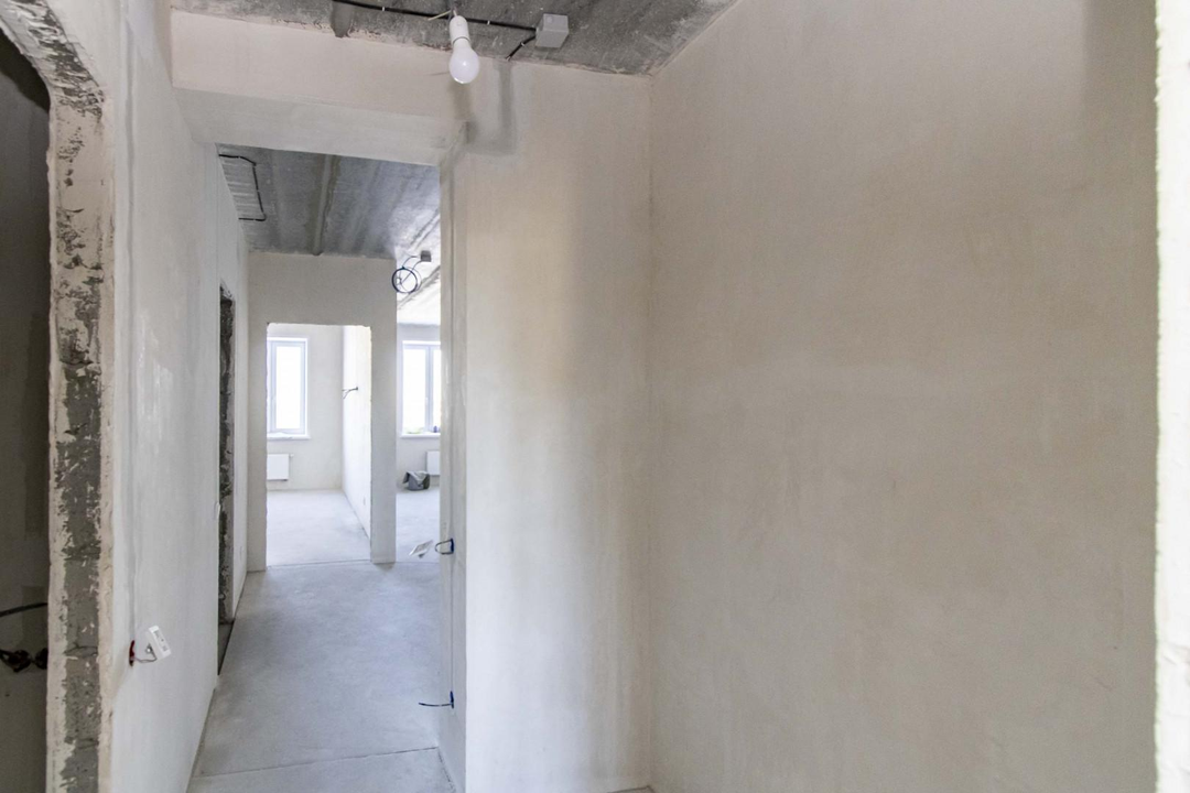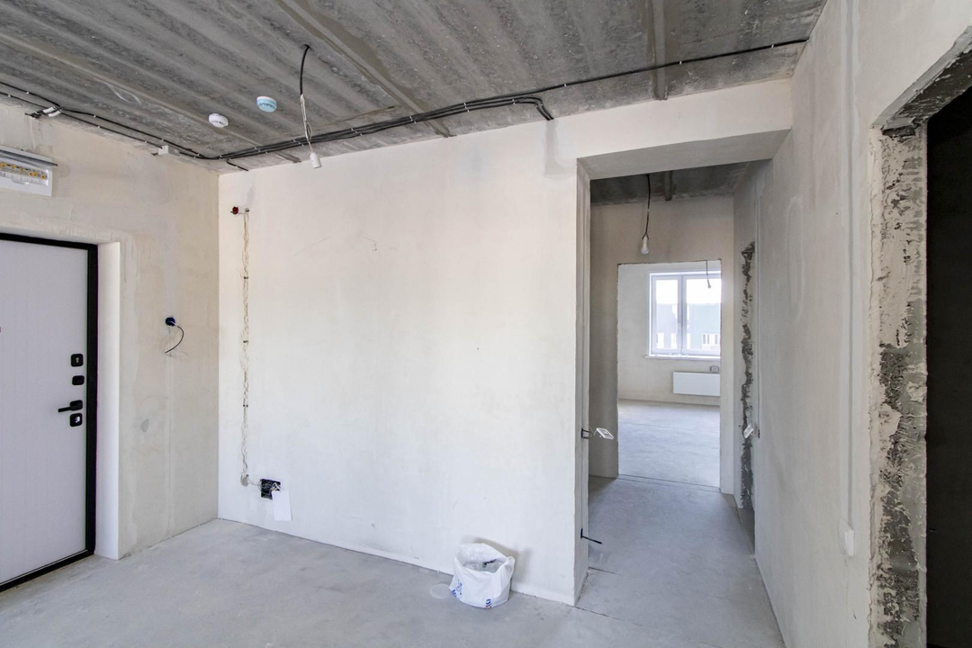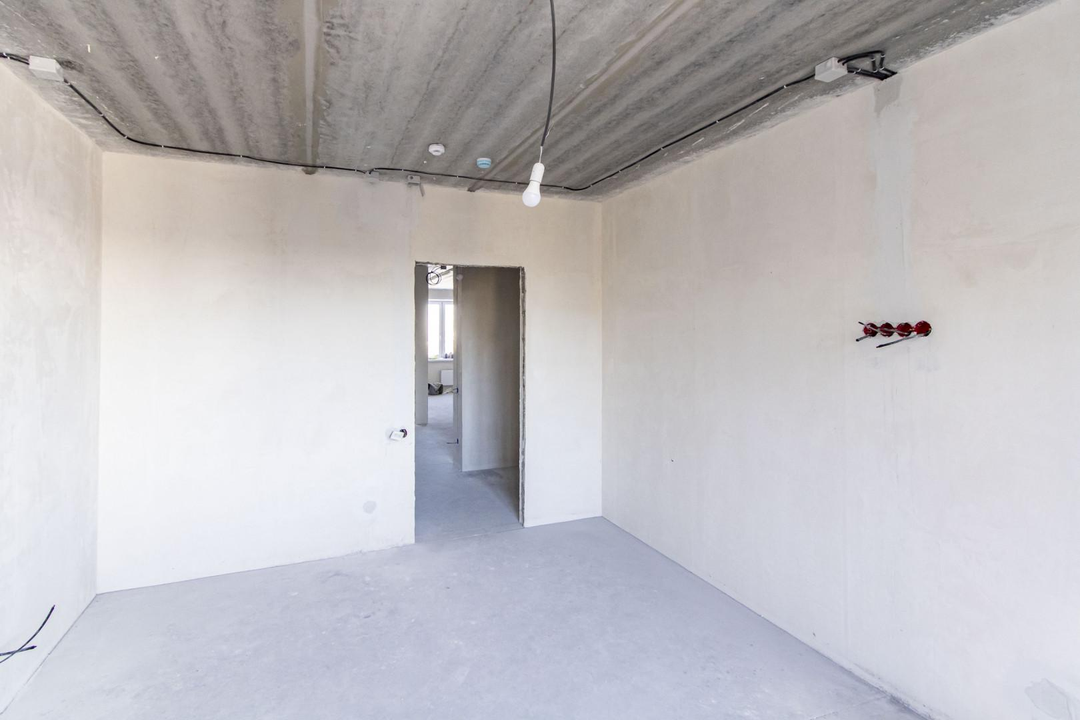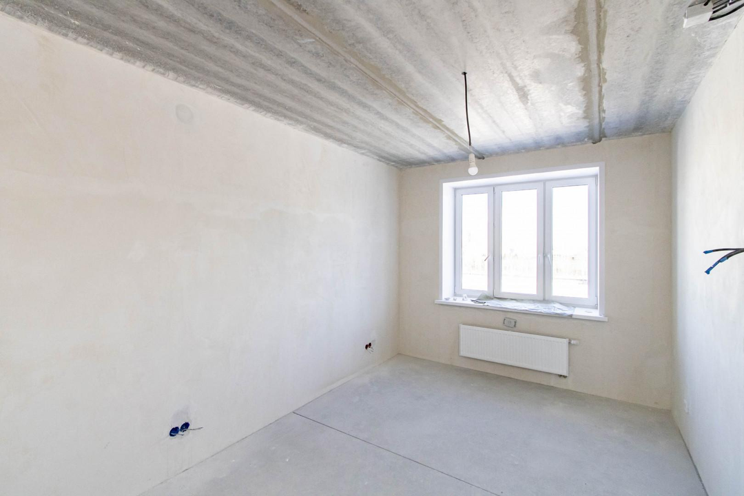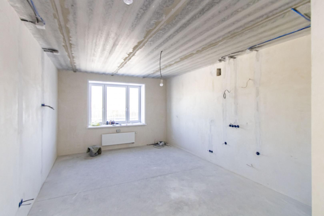 Квартира в предчистовой отделке: цементно-песчанная стяжка пола, стены отштукатурены и выровнены под маяк, электрика разведена по квартира, горизонтальная разводка отопления.
