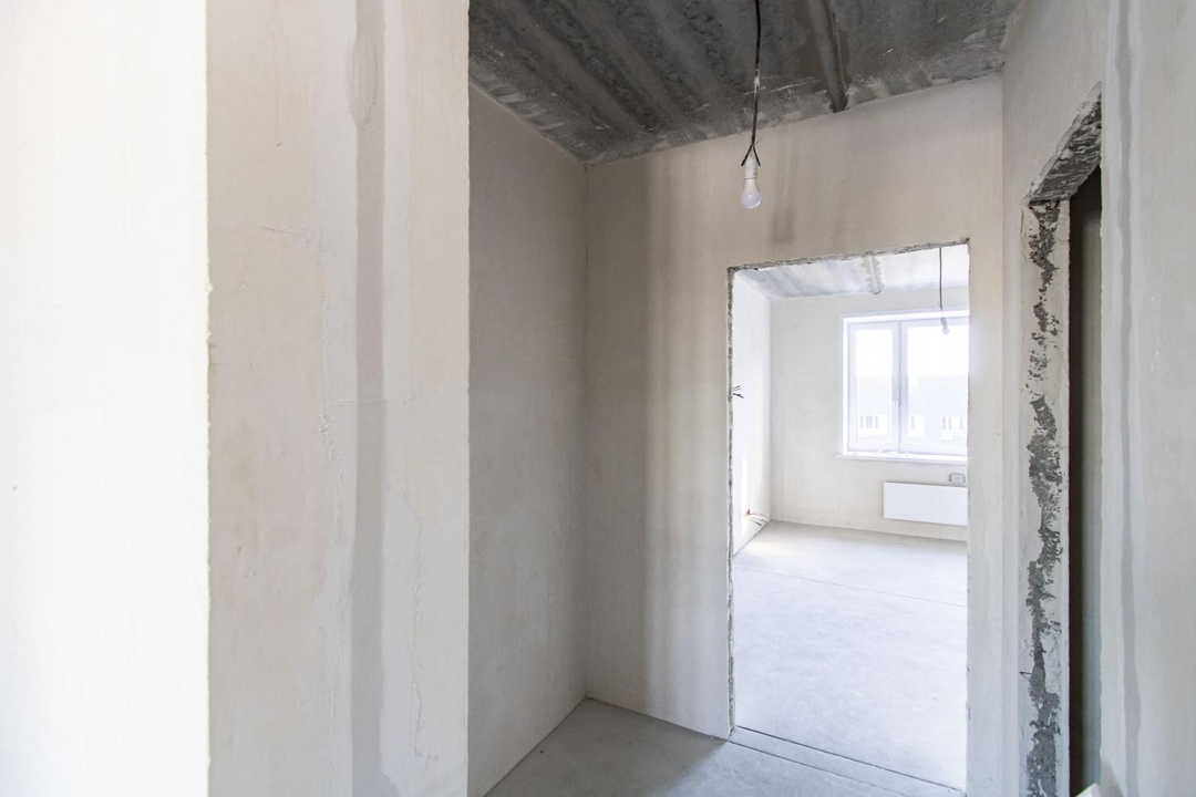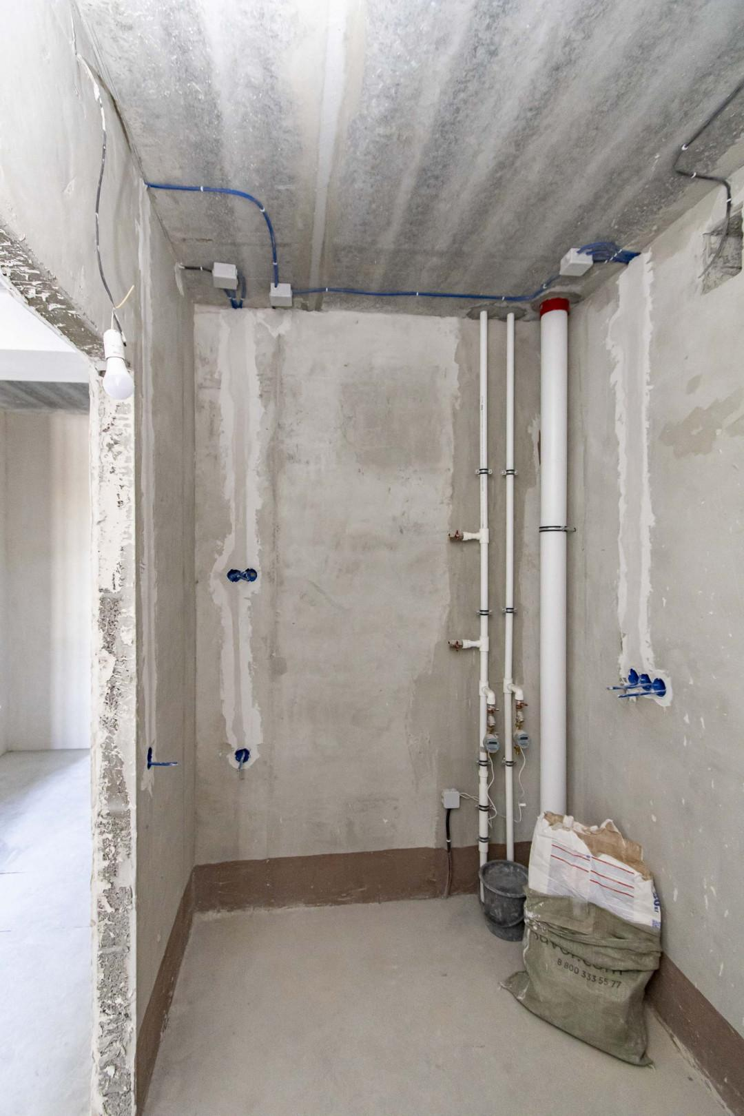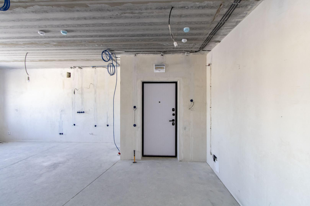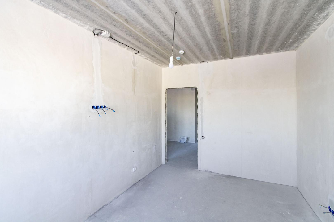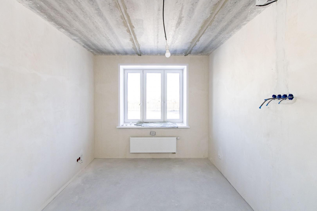 Квартира в предчистовой отделке: цементно-песчанная стяжка пола, стены отштукатурены и выровнены под маяк, электрика разведена по квартира, горизонтальная разводка отопления.
