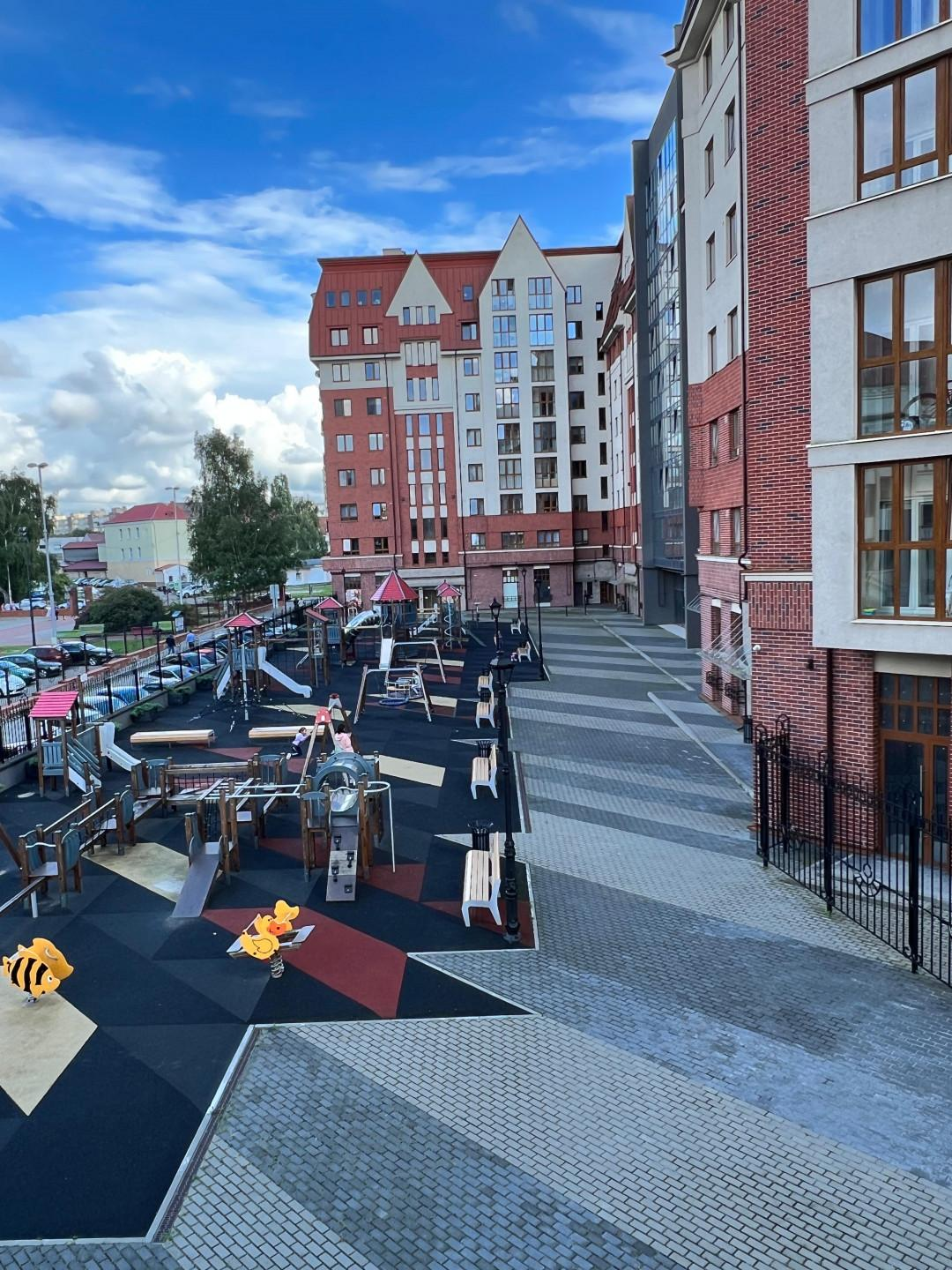 Вид из окон: окна первой комнаты выходят на восток на детскую площадку; окна второй комнаты выходят на детскую площадку и на юг на соседний дом комплекса; окна кухни выходят на юг на ВГТРК Каскад и частично на нижнее озеро.