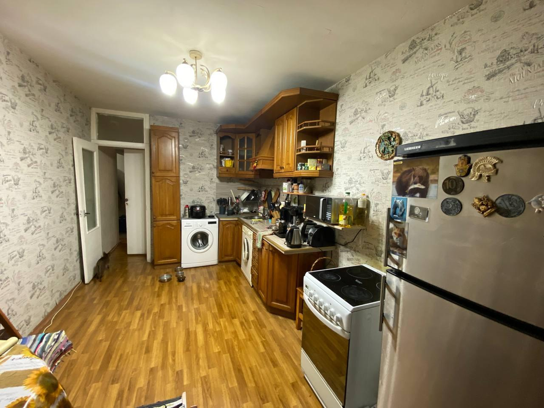 Площадь 70,4 кв.м. Без учёта лоджии и балкона 66 кв.м., жилая 33,8 кв.м., комнаты 21,1+12,4 кв.м., кухня 12,7 кв.м., ванна 2,95 кв.м., туалет 1,03 кв.м., гардеробная 2,96 кв.м., кладовая 1,4 кв.м., коридор 11,5 кв.м.; лоджия 3,67 кв.м., балкон 0,75 кв.м. Окна в квартире выходят на две стороны: во двор (северо-запад) и на улицу Маргелова (юго-восток), удачная планировка, позволяющая увеличивать/зонировать жилое пространство. Кухня с выходом на лоджию и далее на балкон. В 2023 году выполнен косметический ремонт.