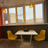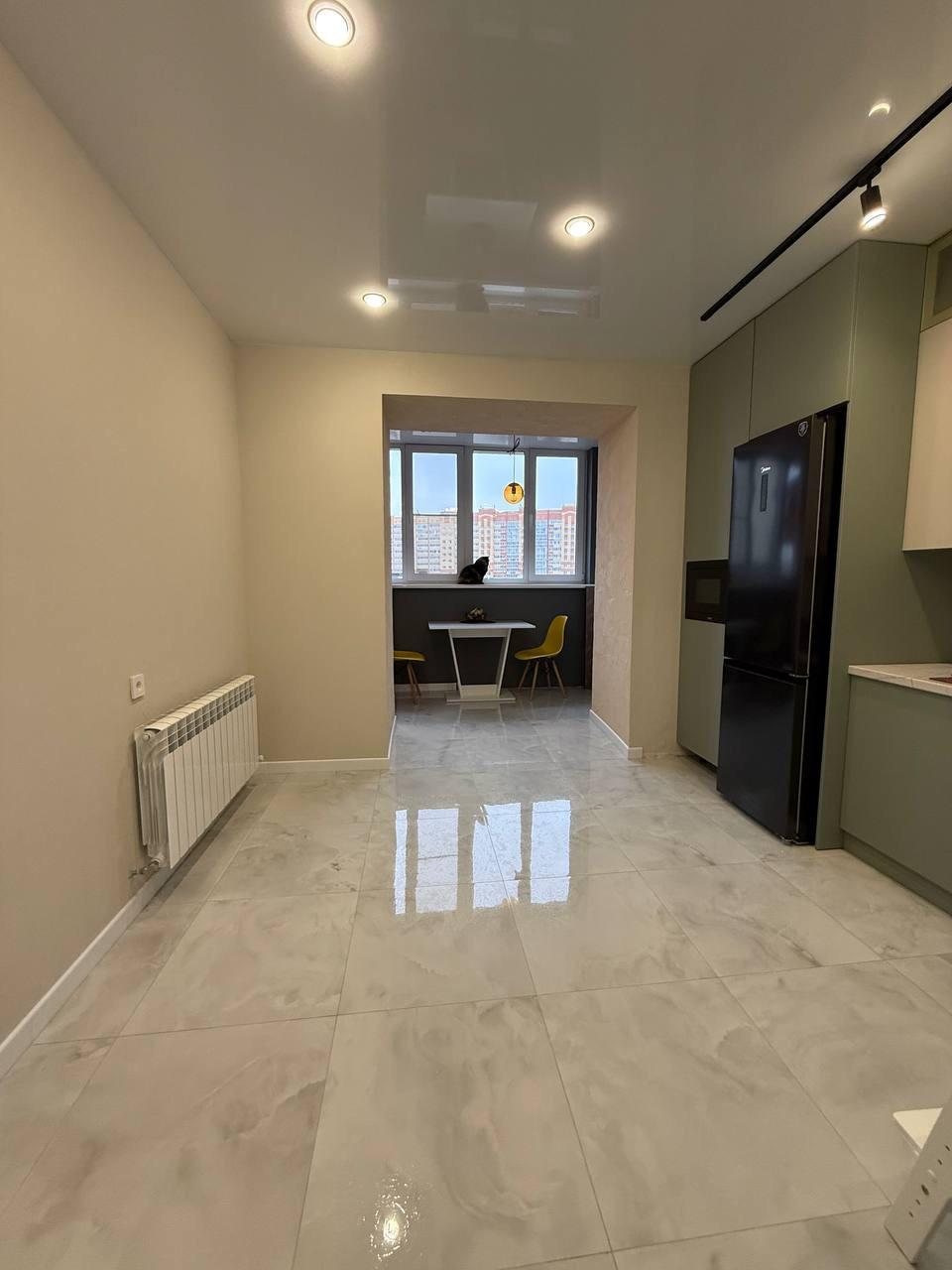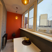 Кухня большая и просторная за счет теплого балкона, объединенного с кухней. На кухне современная мебель с встроенной техникой.
