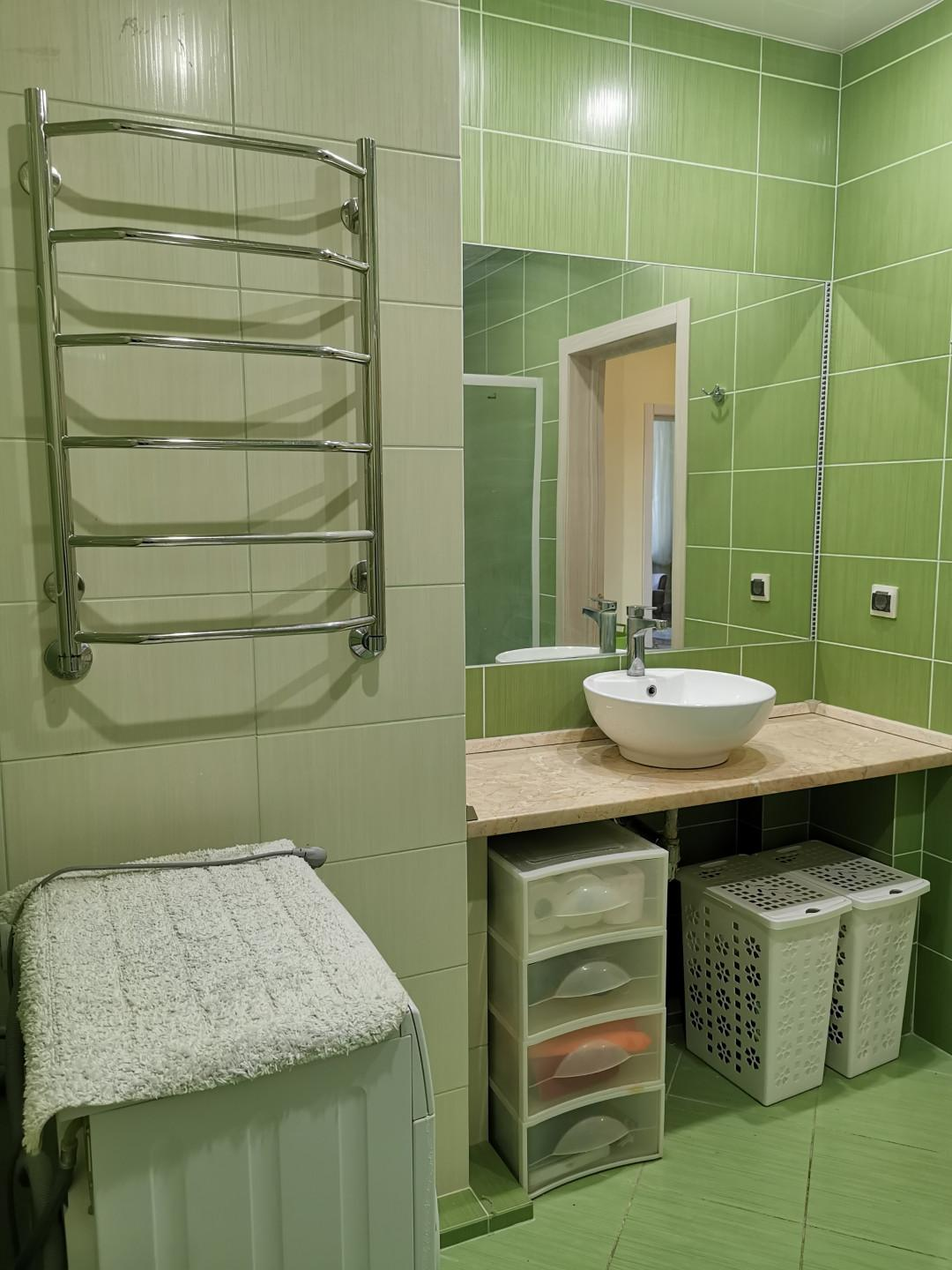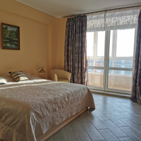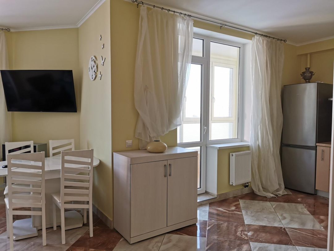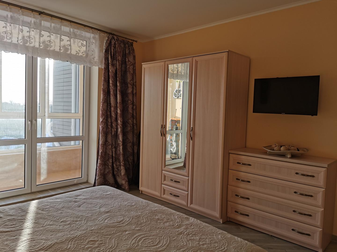Просторная кухня-гостинная с современной мебелью, гарнитуром и техникой (холодильник, встроенная посудомойка, вытяжка, микроволновка, телевизор), с выходом на просторную лоджию, окна которой выходят во двор. Светлая спальня выполнена в теплых тонах с выходом на лоджию, окна которой выходят на обратную сторону дома. Выход на лоджию оформлен двухстворчатыми стеклянными дверьми, открыв которые, можно увеличить площадь спальни за счет лоджии, а на лоджии оформить зону отдыха. Санузел совмещенный и тоже довольно просторный. В квартире сделан качественный евроремонт. Подключено кабельное телевидение и интернет с Wi-Fi. Квартира чистая, уютная, теплая и светлая.