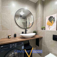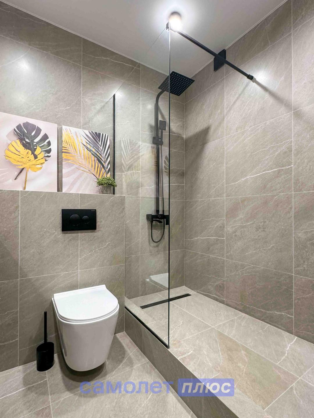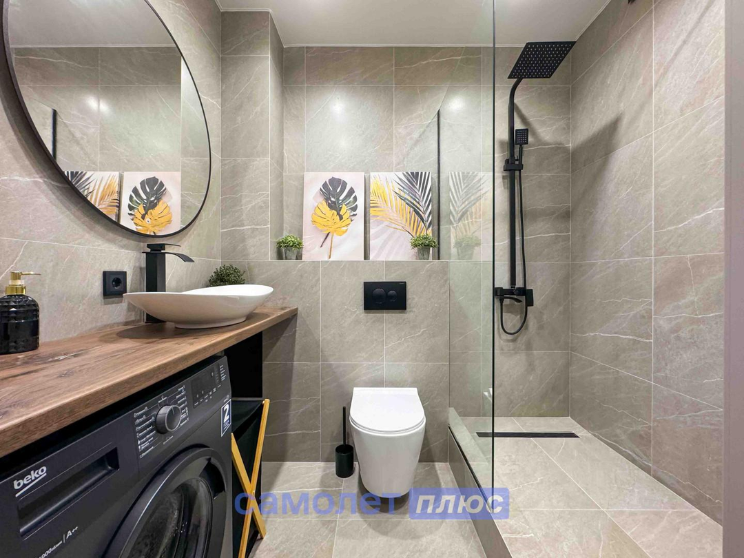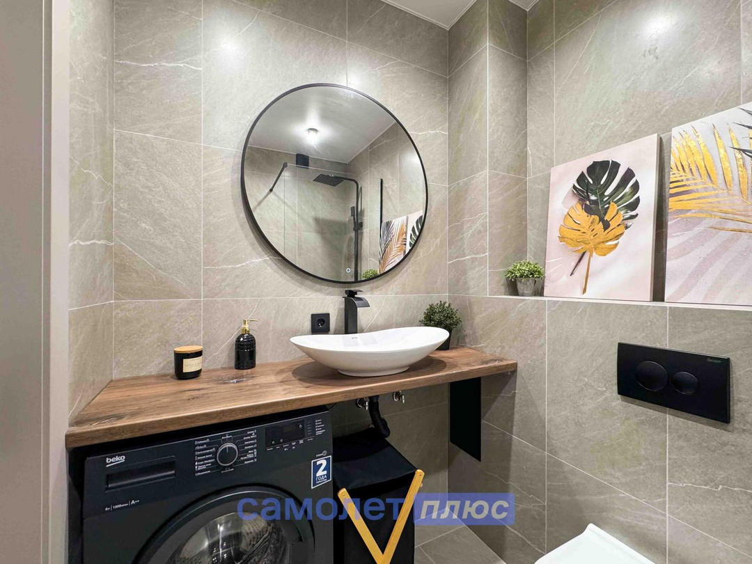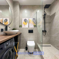 - Санузел оборудован современной сантехникой и аксессуарами, подчеркивая стиль и комфорт.