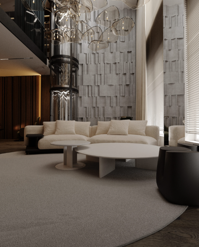 Архитектура: Уникальный архитектурный проект от московского бюро ASADOV. Концепция дома — «из белого шелка»: лаконичная форма, белый камень, медные акценты. Это не типовой параллелепипед, а продуманный объект с панорамным порталом и «парящими» пентхаусами .Гранд-лобби: Сердце дома — двухсветное гранд-лобби с куполом. Это гибридное пространство, объединяющее улицу и интерьер: рисунок брусчатки продолжается в холле. Здесь расположены ресепшен, коворкинг, лаунж-зоны, переговорные, кофе-поинт, зона с экокамином, арт-объекты (в том числе винтовая лестница из акцентной меди), лапомойка и колясочная. Пространство доступно не только резидентам, но и горожанам, становясь новой точкой притяжения Тюмени .Паркинг: Подземный паркинг на 141 машиноместо с зарядными станциями для электромобилей .Безопасность: Закрытый двор, консьерж-сервис, видеонаблюдение.Инфраструктура в здании: На первых этажах — торговая галерея с магазинами и кафе, на втором — офисные пространства и коворкинг. Резиденты могут жить, работать и решать бытовые вопросы, не выходя из дома .