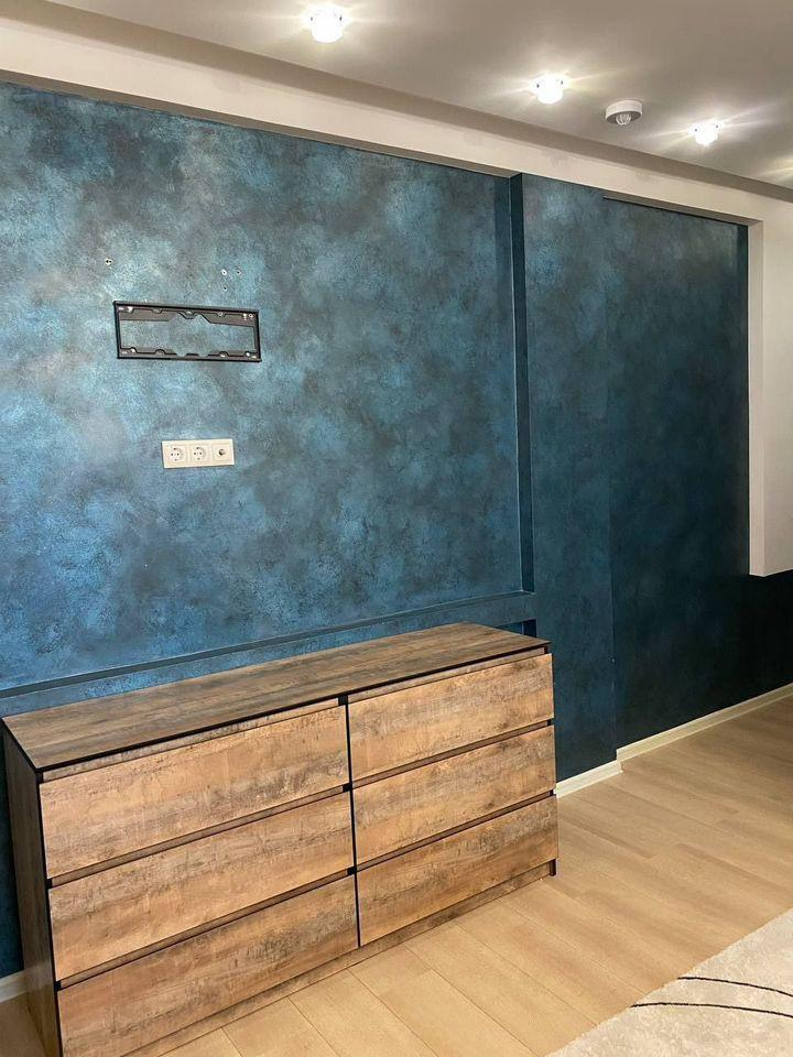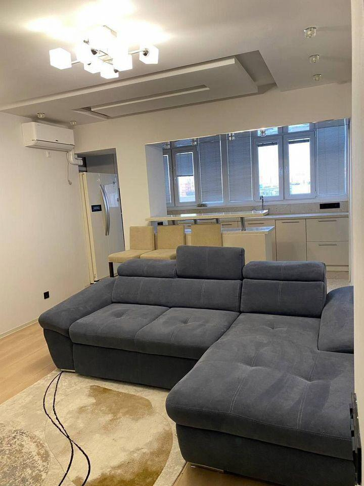Кухня‑гостиная укомплектована:обеденным столом;новым большим раскладным диваном;телевизором;кондиционером;барной стойкой со стульями.