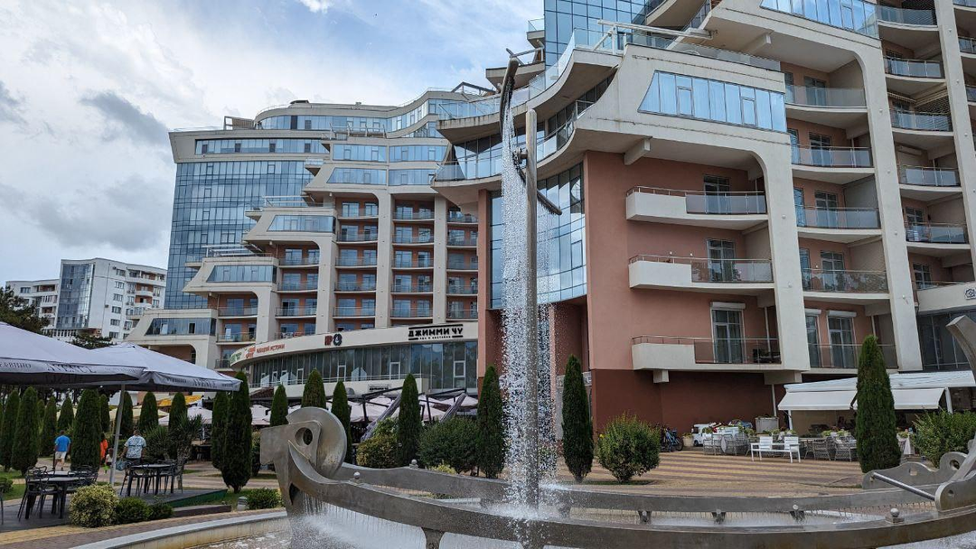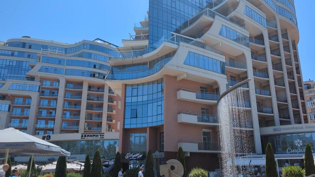 Прекрасный вид на море и бассейн на придомовой территории комплекса.