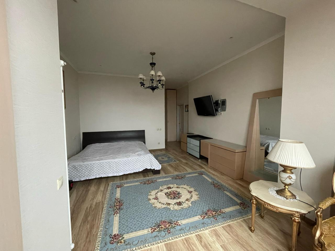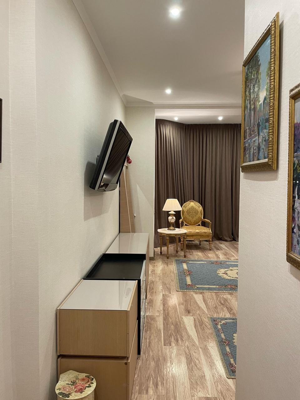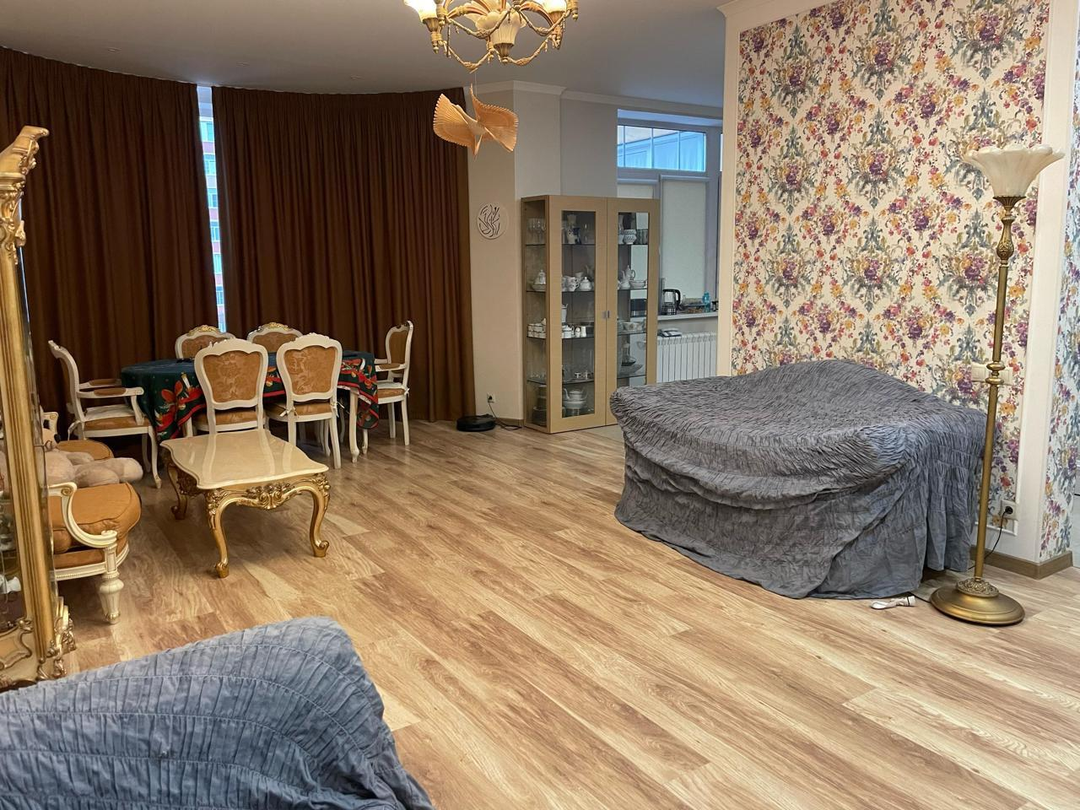 Квартира находится на 12 этаже 18-этажного монолитного дома 2020 года постройки. Высота потолков — 3 метра. Планировка включает большую гостиную, две спальни, кухню площадью 12 м² с выходом на лоджию, два совмещённых санузла и постирочную. Выполнен дизайнерский ремонт, установлены тёплые полы и шумоизоляция. Из окон открывается вид на улицу и во двор. Квартира продаётся с мебелью, полностью готова к проживанию.