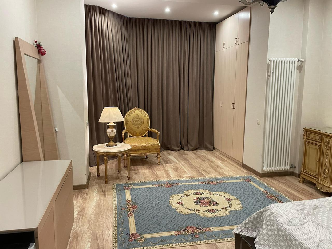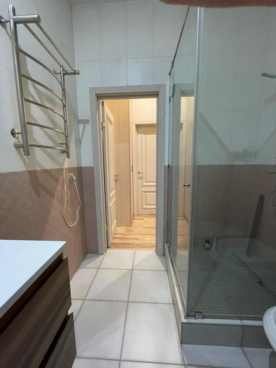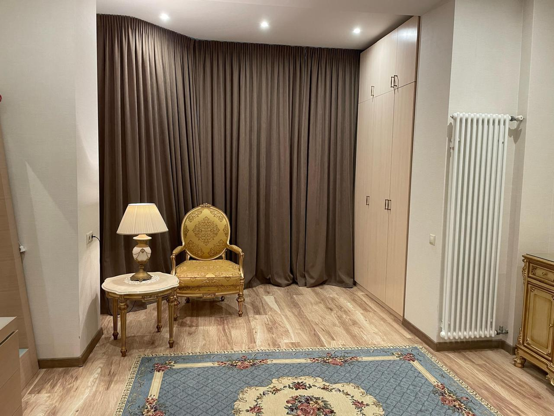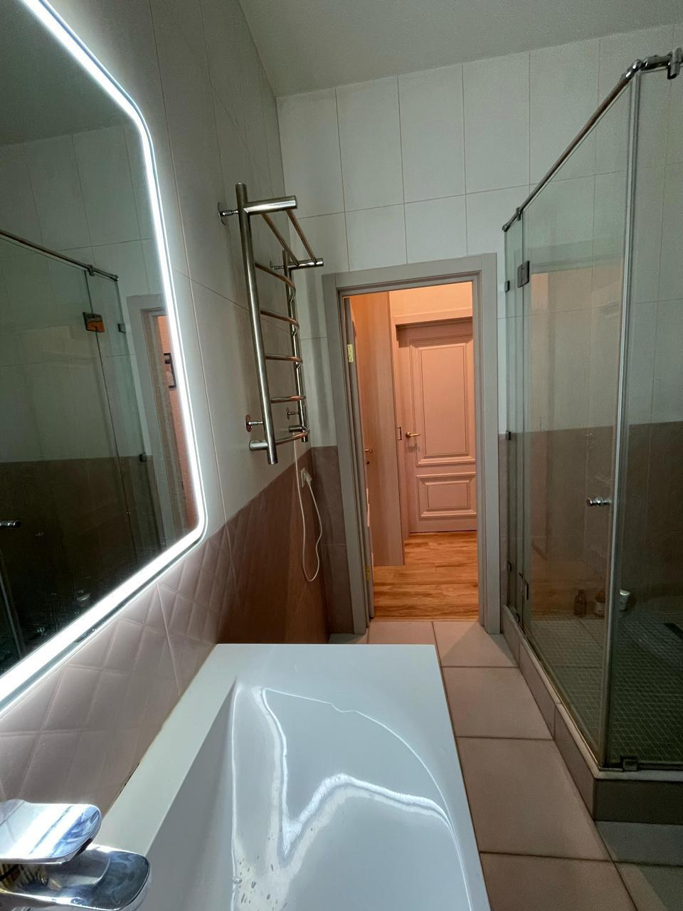 Квартира находится на 12 этаже 18-этажного монолитного дома 2020 года постройки. Высота потолков — 3 метра. Планировка включает большую гостиную, две спальни, кухню площадью 12 м² с выходом на лоджию, два совмещённых санузла и постирочную. Выполнен дизайнерский ремонт, установлены тёплые полы и шумоизоляция. Из окон открывается вид на улицу и во двор. Квартира продаётся с мебелью, полностью готова к проживанию.