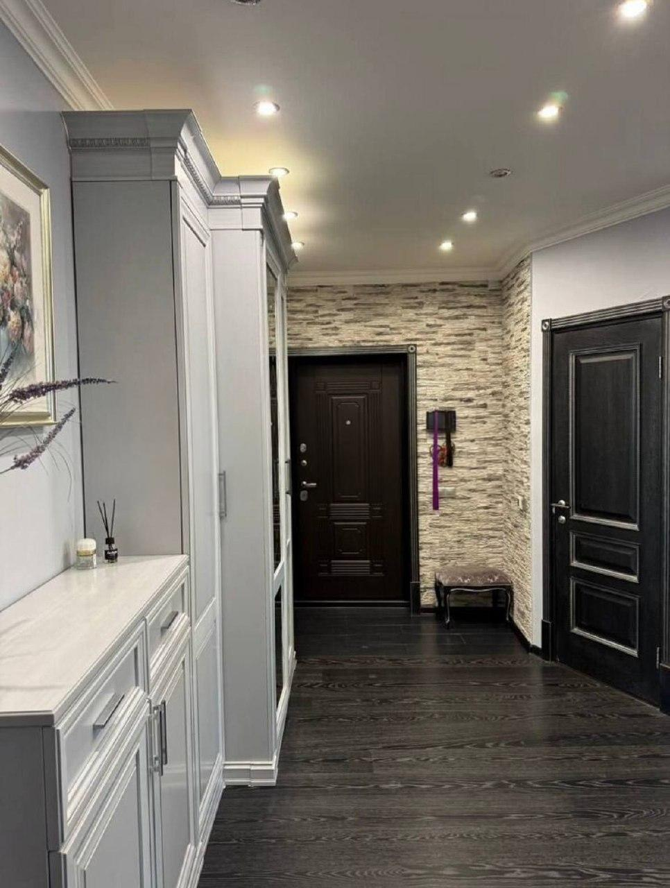 Планировка изменена: из коридора общее помещение гостиной и кухни. Лоджия часть кухни. Вход в спальню и мы видим коридор, где справа дверь в гардеробную. Комнаты светлые, большие. Красивый современный ремонт.