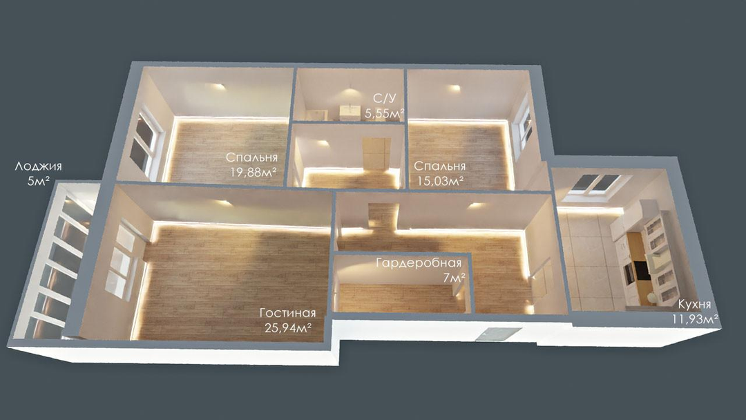 - несколько сценариев освещения в каждой комнате для разного времени суток