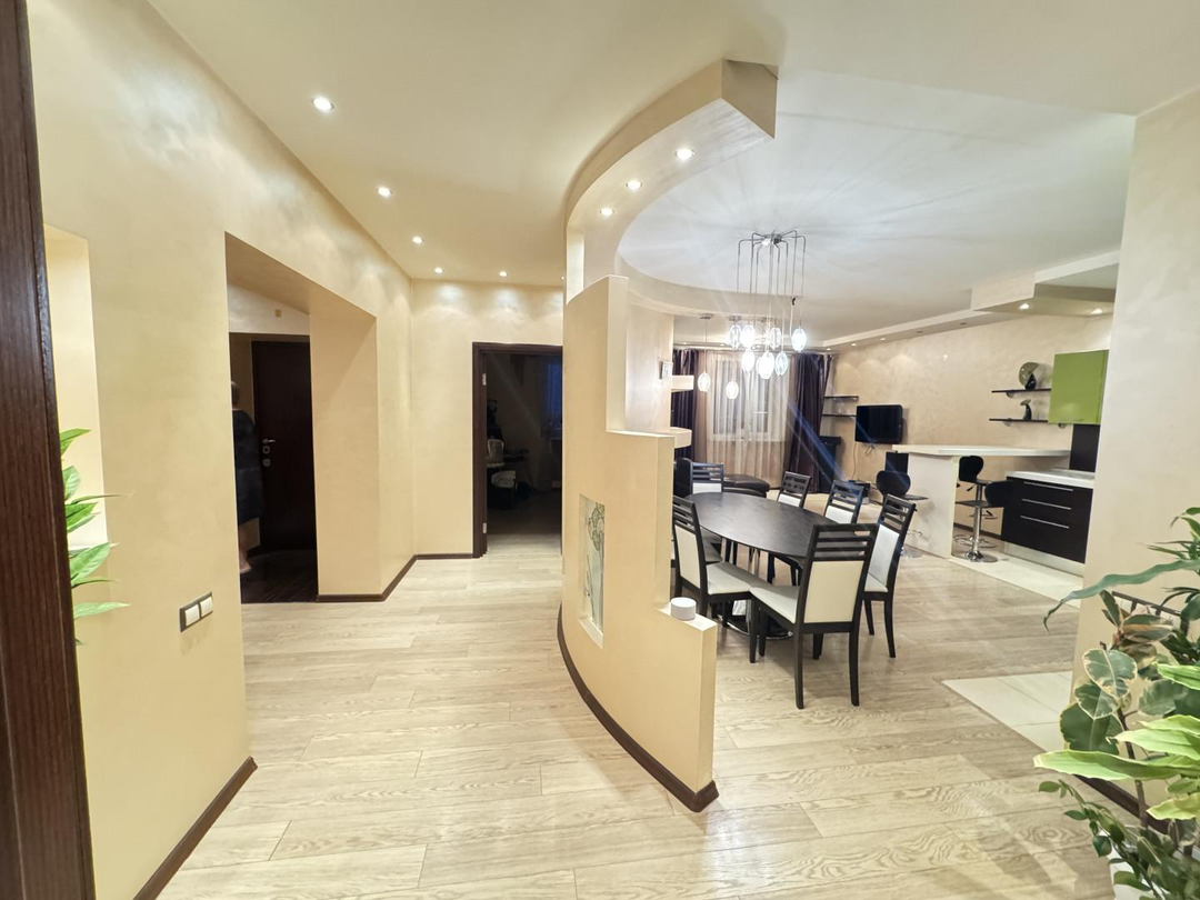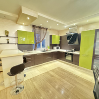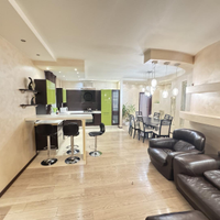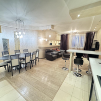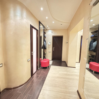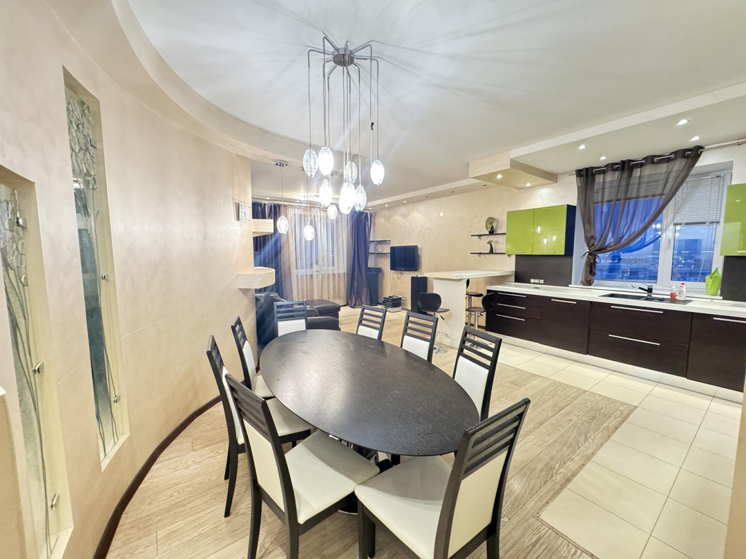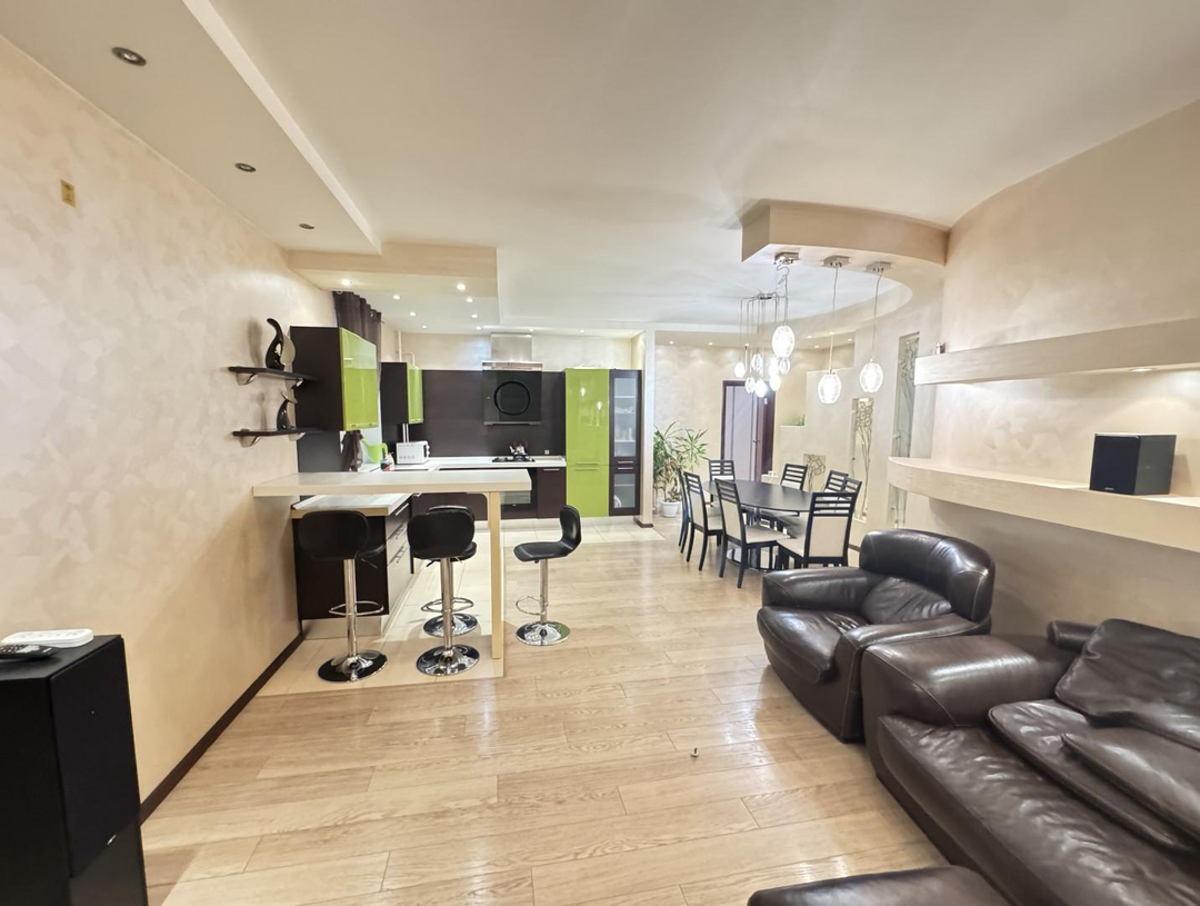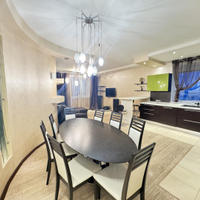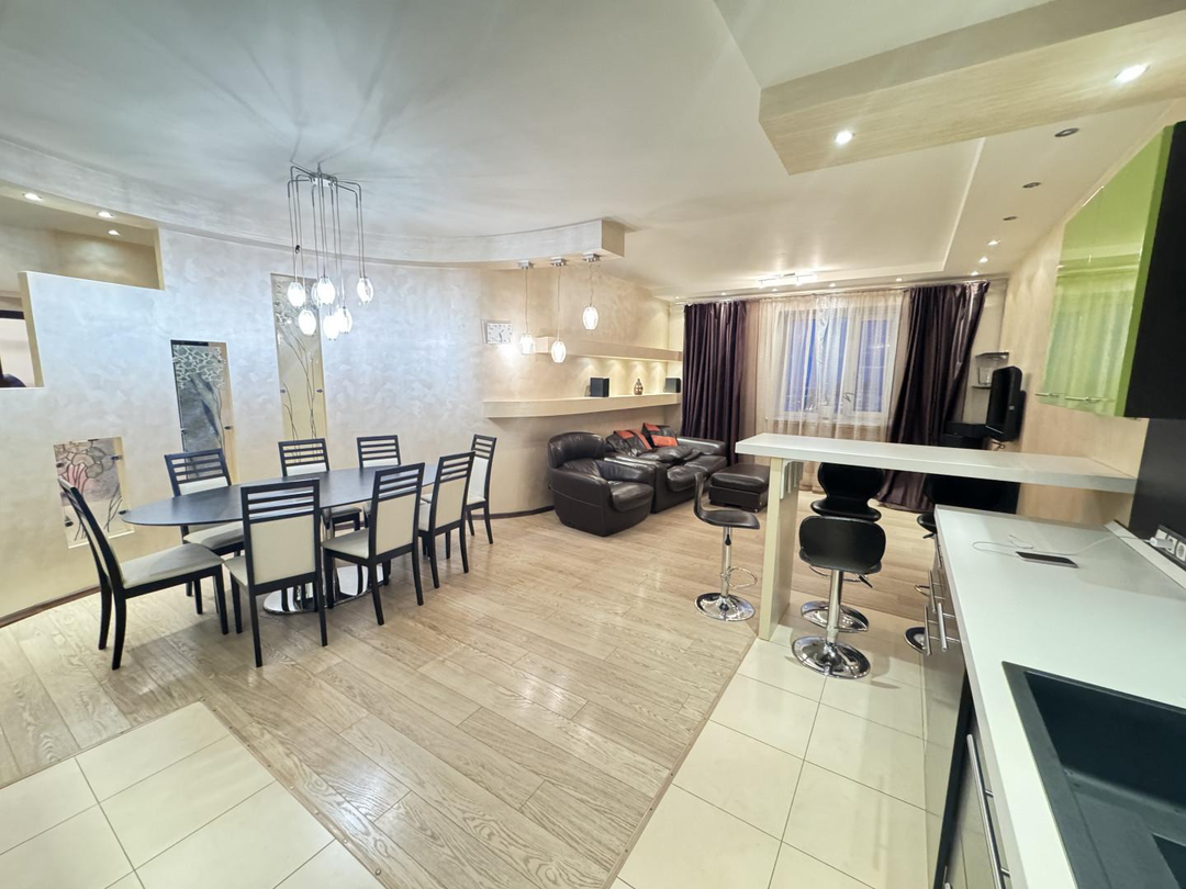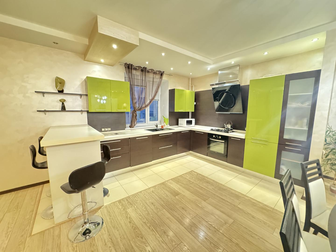 В квартире выполнен дизайнерский ремонт. Установлен стильный двухуровневый потолок с встроенной подсветкой, в коридоре и кухне пол – ламинат, рабочая зона кухни – керамогранит, а также полы с подогревом. Вся мебель и техника на фото остается, а именно: барные стулья, двухместный кожаный диван, кресло, и пуф выполненные в одном стиле. Кухонный гарнитур, обеденный стол и стулья в темных тонах. Вся мебель сделана в Италии. Из техники остается: плазменный телевизор. Посудомоечная, стиральная машины от фирмы «Electrolux», а также духовой шкаф «Hansa», вытяжка «Elica» и домашний кинотеатр «Toshiba»,