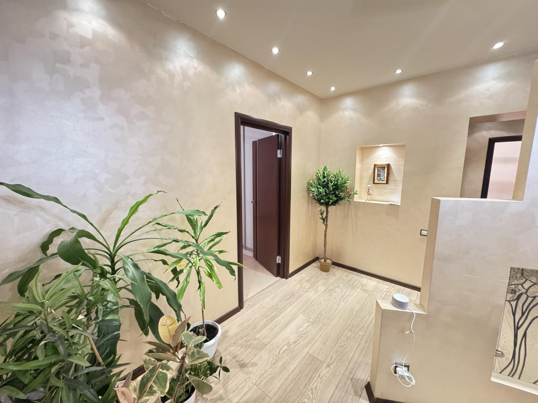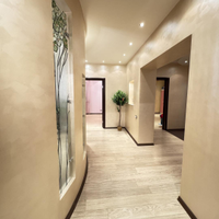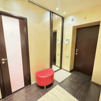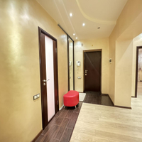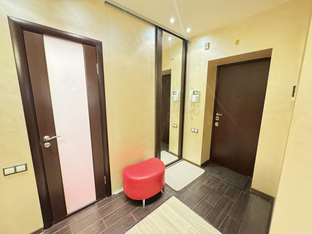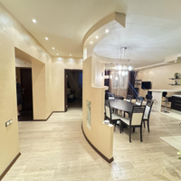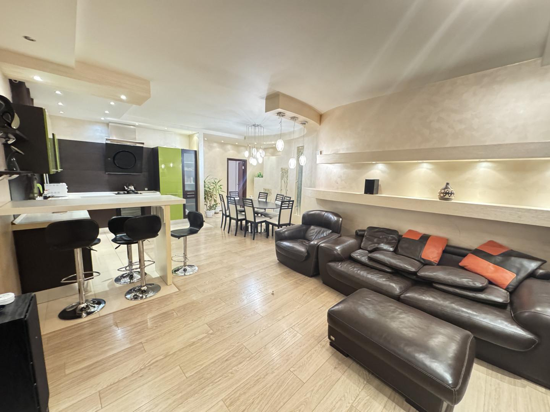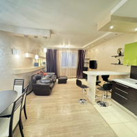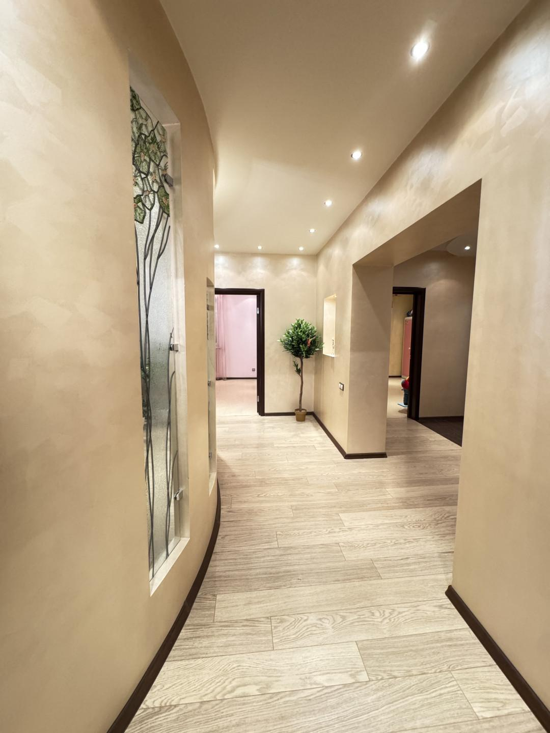 В квартире выполнен дизайнерский ремонт. Установлен стильный двухуровневый потолок с встроенной подсветкой, в коридоре и кухне пол – ламинат, рабочая зона кухни – керамогранит, а также полы с подогревом. Вся мебель и техника на фото остается, а именно: барные стулья, двухместный кожаный диван, кресло, и пуф выполненные в одном стиле. Кухонный гарнитур, обеденный стол и стулья в темных тонах. Вся мебель сделана в Италии. Из техники остается: плазменный телевизор. Посудомоечная, стиральная машины от фирмы «Electrolux», а также духовой шкаф «Hansa», вытяжка «Elica» и домашний кинотеатр «Toshiba»,