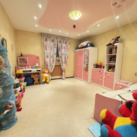 В детской комнате просторная детская кровать, а также шкафы и комоды единого розового цвета. И также пробковый пол.