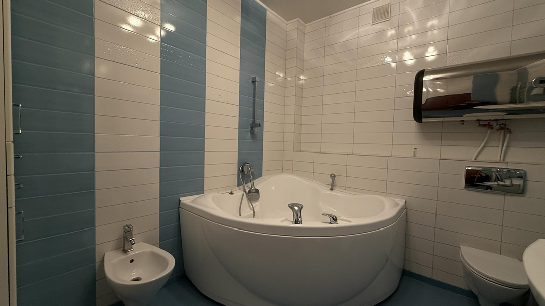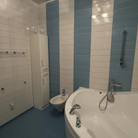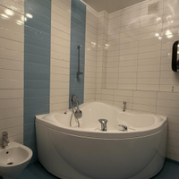 Гостевой санузел с раковиной и просторная ванная комната с туалетом, биде, раковиной и угловой ванной