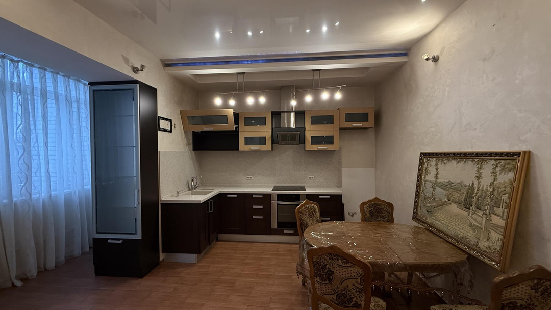 Просторная, полностью оборудованная кухня, включает кухонный гарнитур, стильную обеденную группу и комфортный кожаный раскладной диван