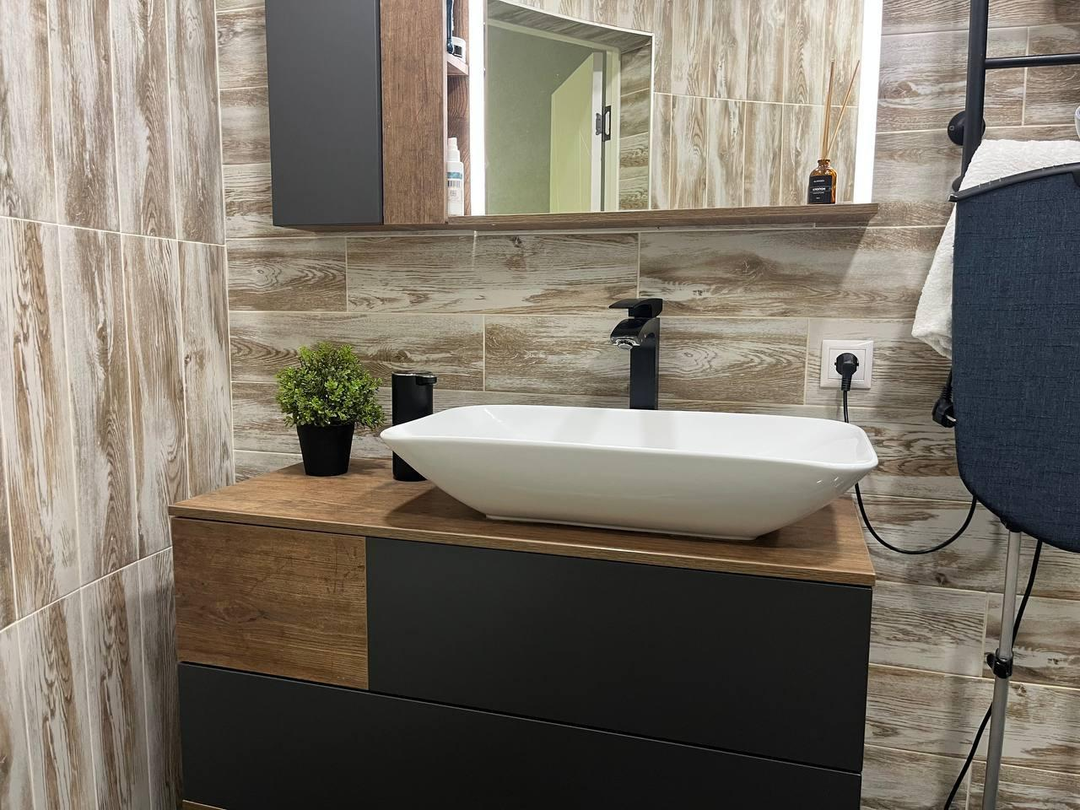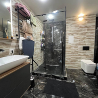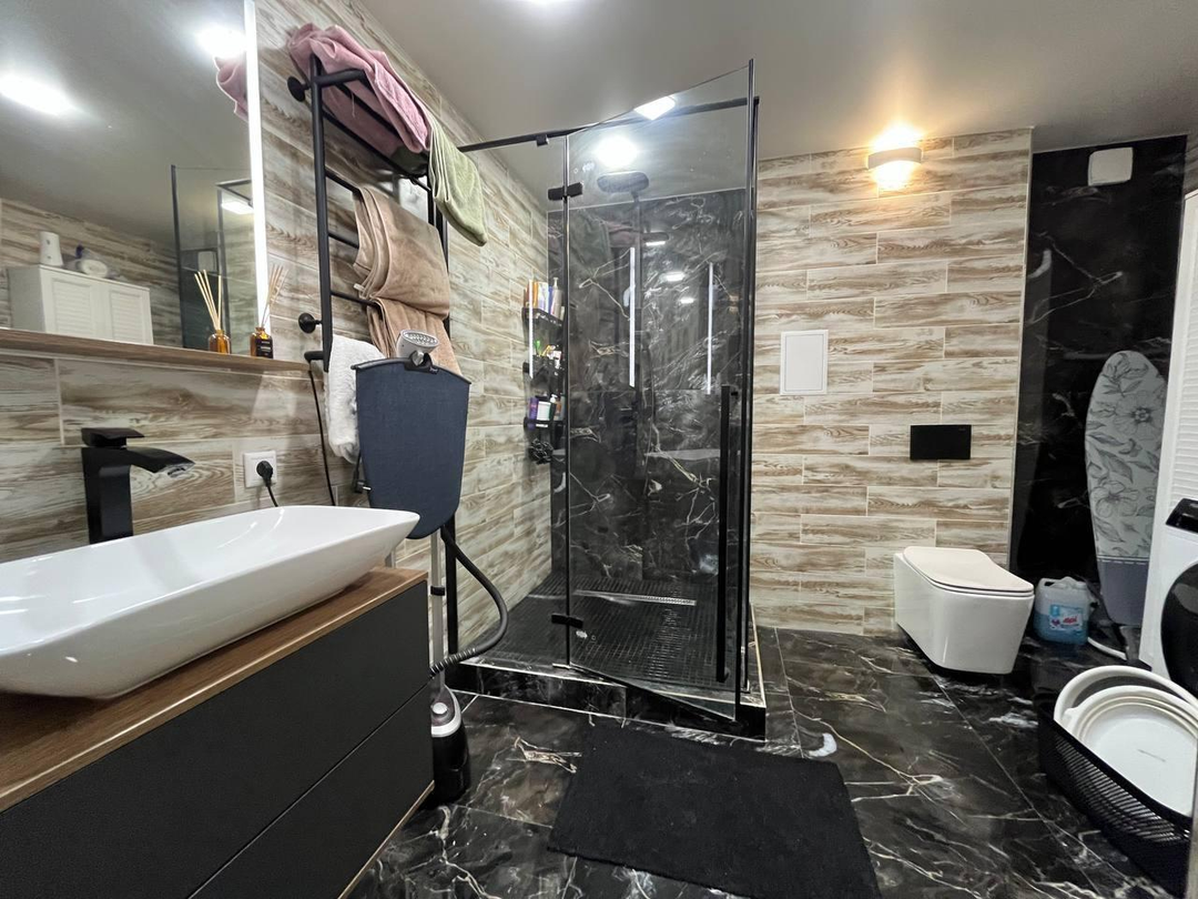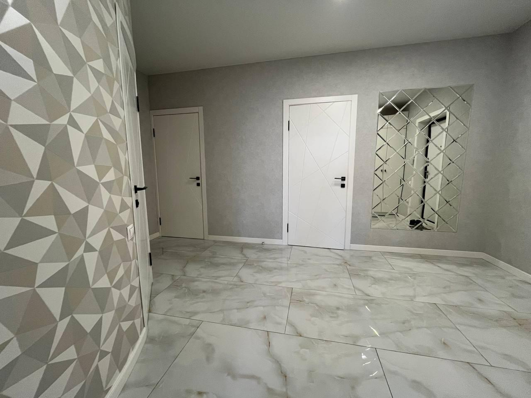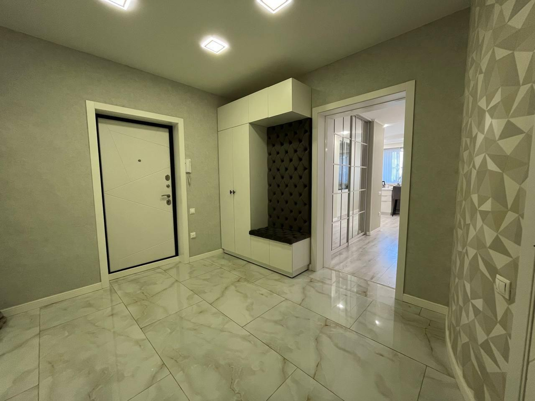 Выполнен с использованием премиальных материалов: Дизайнерские обои Качественный ламинат и плитка Встроенные светильники Сантехника премиум-класса
