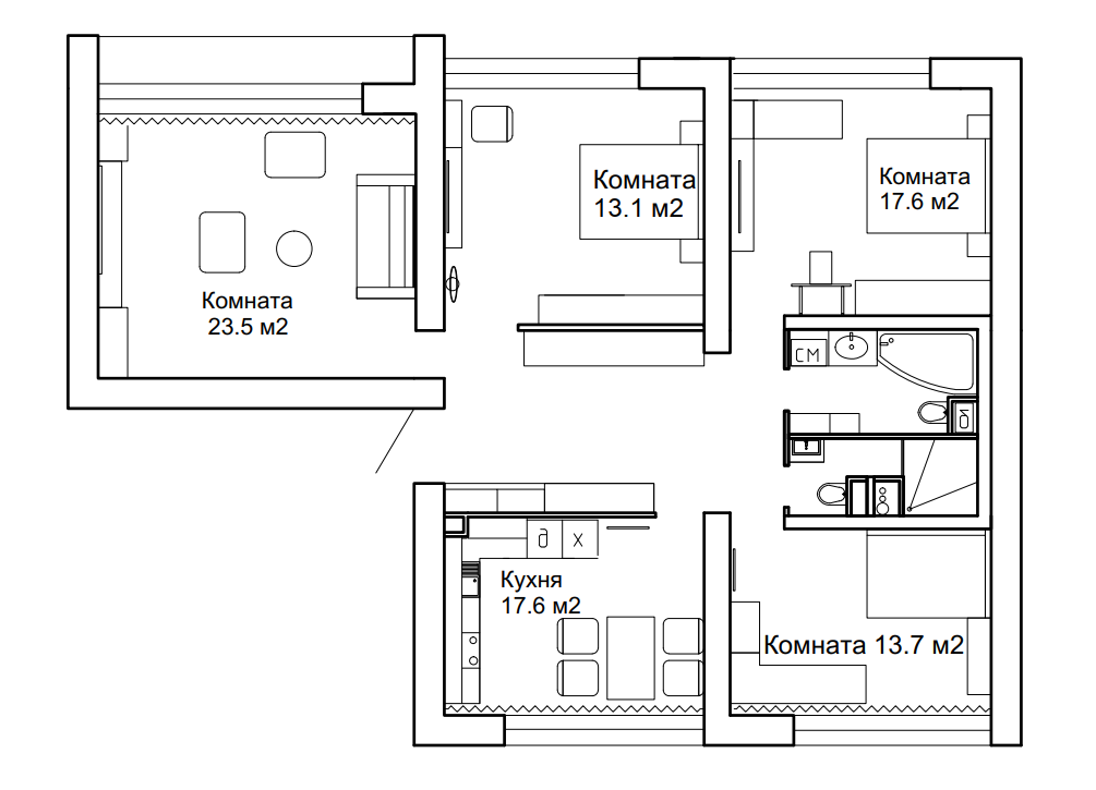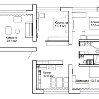 Каждая комната в квартире имеет свои особенности: Просторная комната 1 площадью 23.5 кв.м. станет идеальным местом для вашей спальни или кабинета.